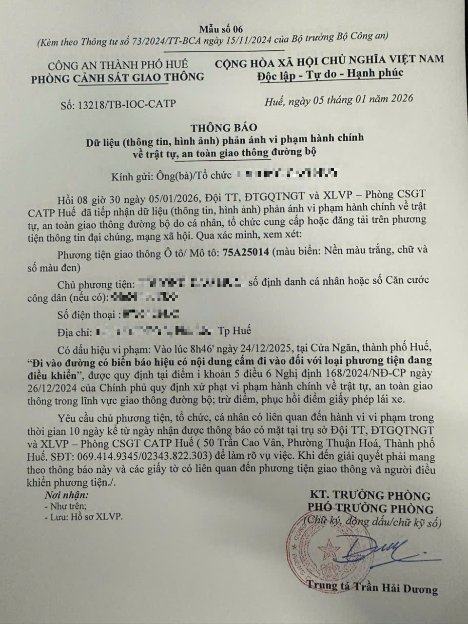 Qua hình ảnh phản ánh, Phòng Cảnh sát giao thông xác định lỗi vi phạm của người điều khiển phương tiện 75A25014 như sau: Đi vào đường có biển báo hiệu có nội dung cấm đi vào đối với loại phương tiện đang điều khiển, được quy định tại Điểm i khoản 5 Điều 6 Nghị định số 168/2024/NĐ-CP ngày 26/12/2024 của Chính phủ.