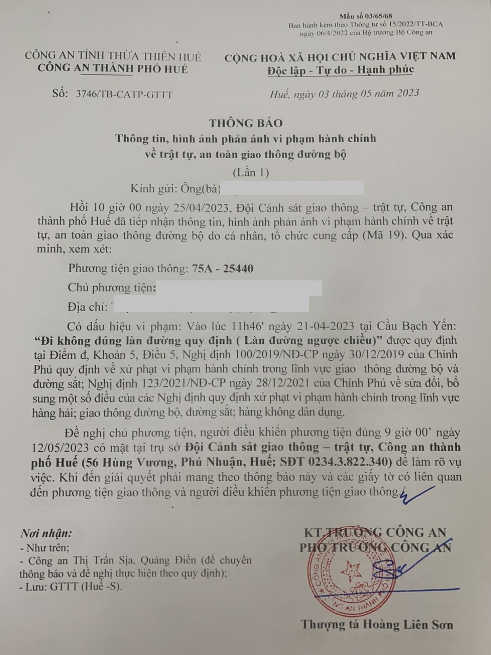 Vấn đề quý Ông/Bà phản ánh, Công an tỉnh đã chỉ đạo Công an thành phố Huế kiểm tra và xin thông báo kết quả như sau: