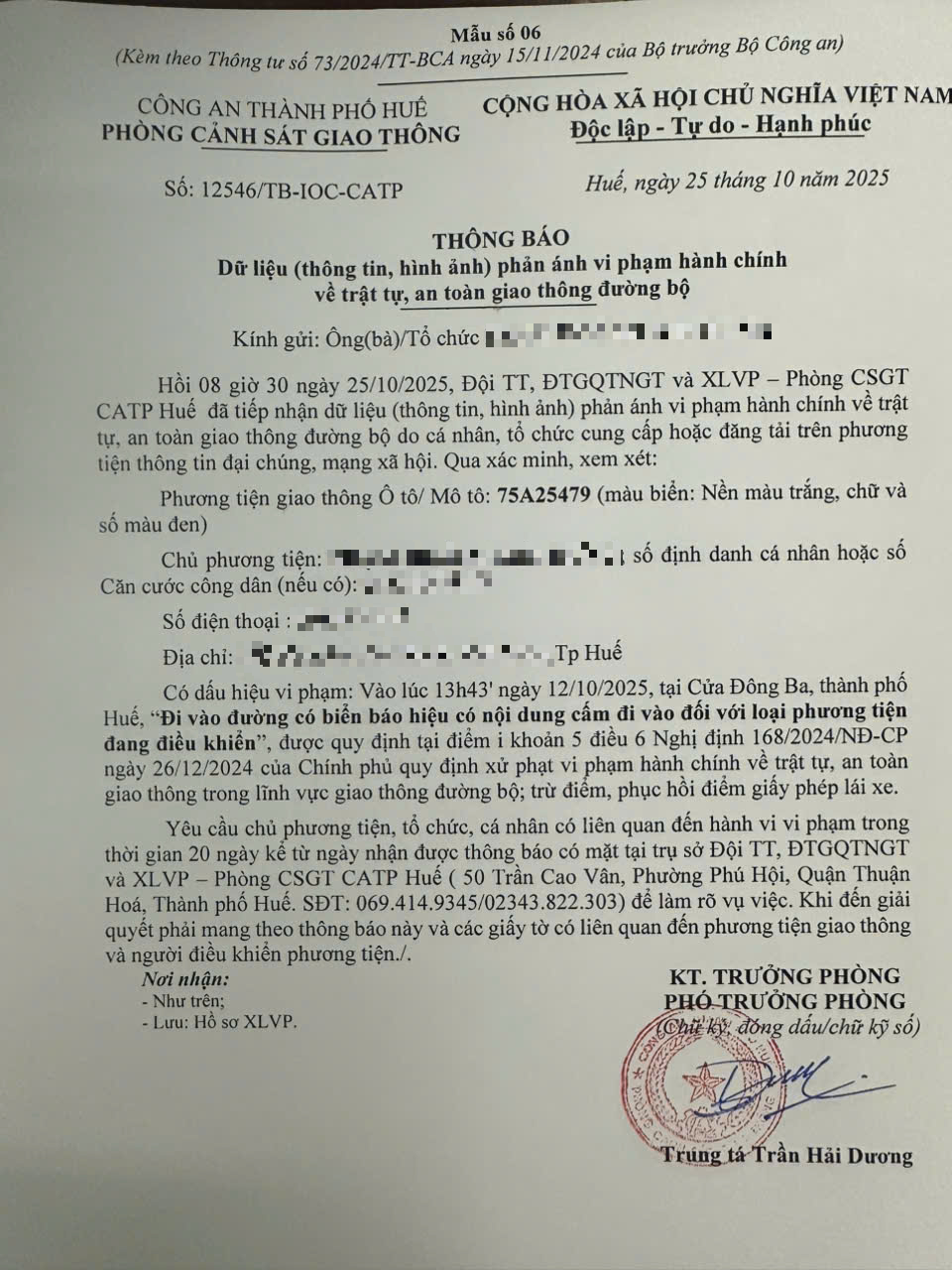 Qua hình ảnh phản ánh, người điều khiển phương tiện BKS 75A25479 có dấu hiệu vi phạm lỗi: Đi vào đường có biển báo hiệu có nội dung cấm đi vào đối với loại phương tiện đang điều khiển, quy định tại điểm i, khoản 5, điều 6 Nghị định số 168/2024/NĐ-CP ngày 26/12/2024 của Chính phủ quy định xử phạt vi phạm hành chính về trật tự, an toàn giao thông trong lĩnh vực giao thông đường bộ; trừ điểm, phục hồi điểm giấy phép lái xe.
