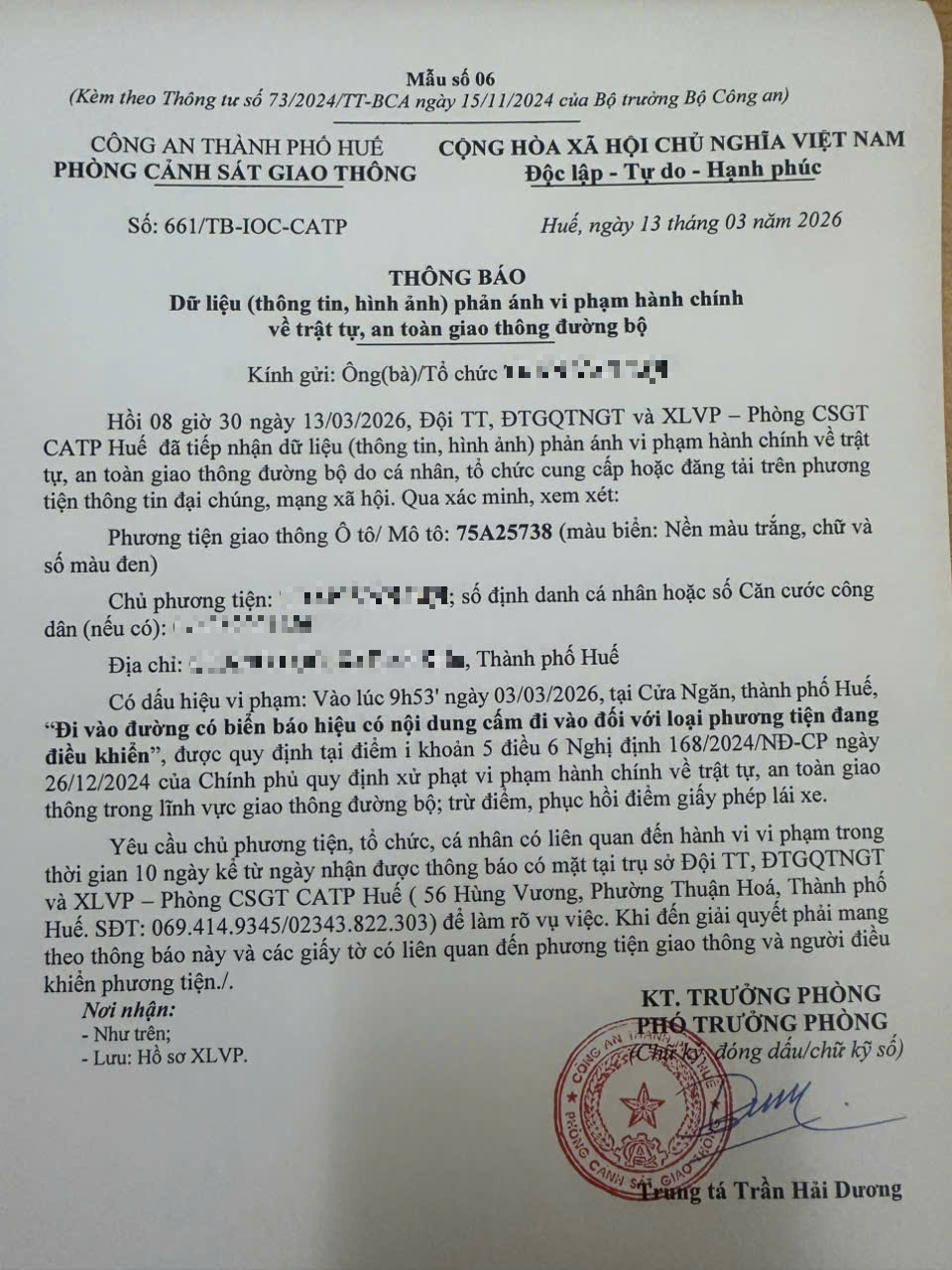 Qua hình ảnh phản ánh, Phòng Cảnh sát giao thông xác định lỗi vi phạm của người điều khiển phương tiện 75A25738 như sau: “Đi vào đường có biển báo hiệu có nội dung cấm đi vào đối với loại phương tiện đang điều khiển”, quy định tại điểm i, khoản 5, điều 6 Nghị định 168/2024/NĐ-CP.