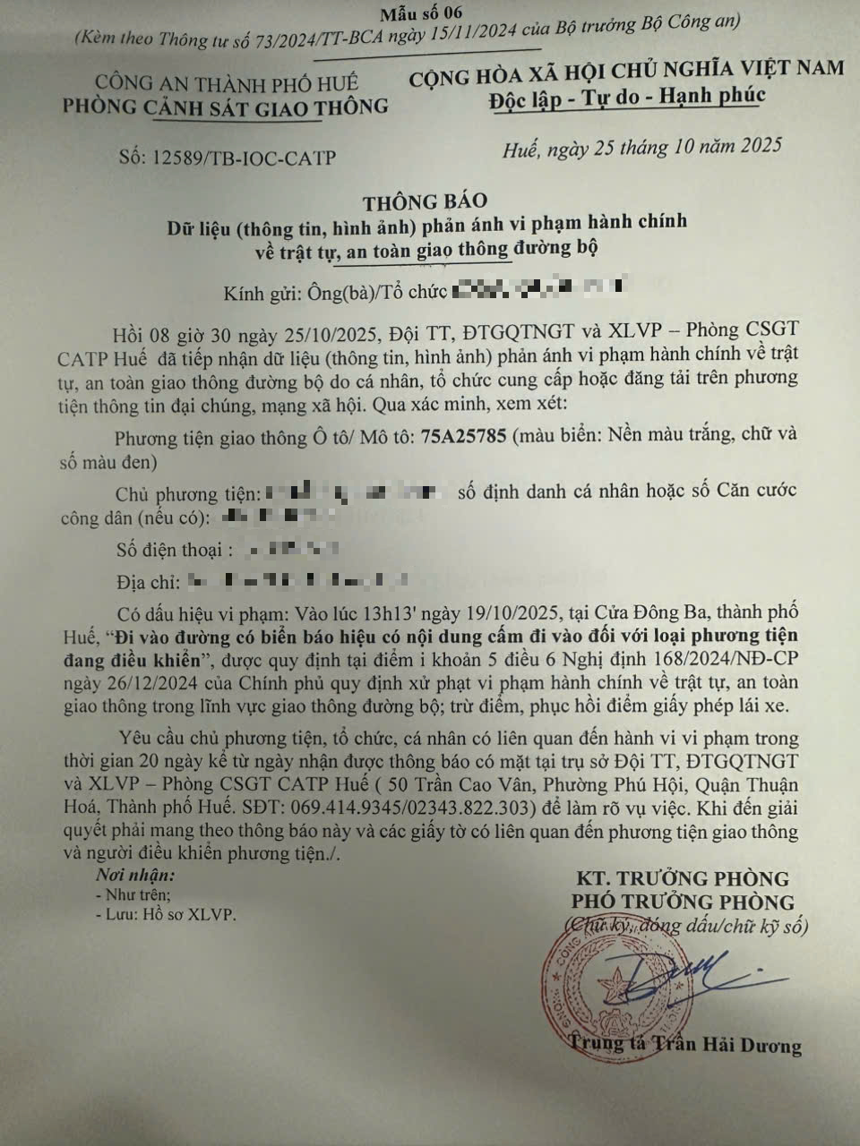 Qua hình ảnh phản ánh, Phòng Cảnh sát giao thông xác định lỗi vi phạm của người điều khiển phương tiện 75A25785 như sau: Đi vào đường có biển báo hiệu có nội dung cấm đi vào đối với loại phương tiện đang điều khiển, được quy định tại Điểm i khoản 5 Điều 6 Nghị định số 168/2024/NĐ-CP ngày 26/12/2024 của Chính phủ.