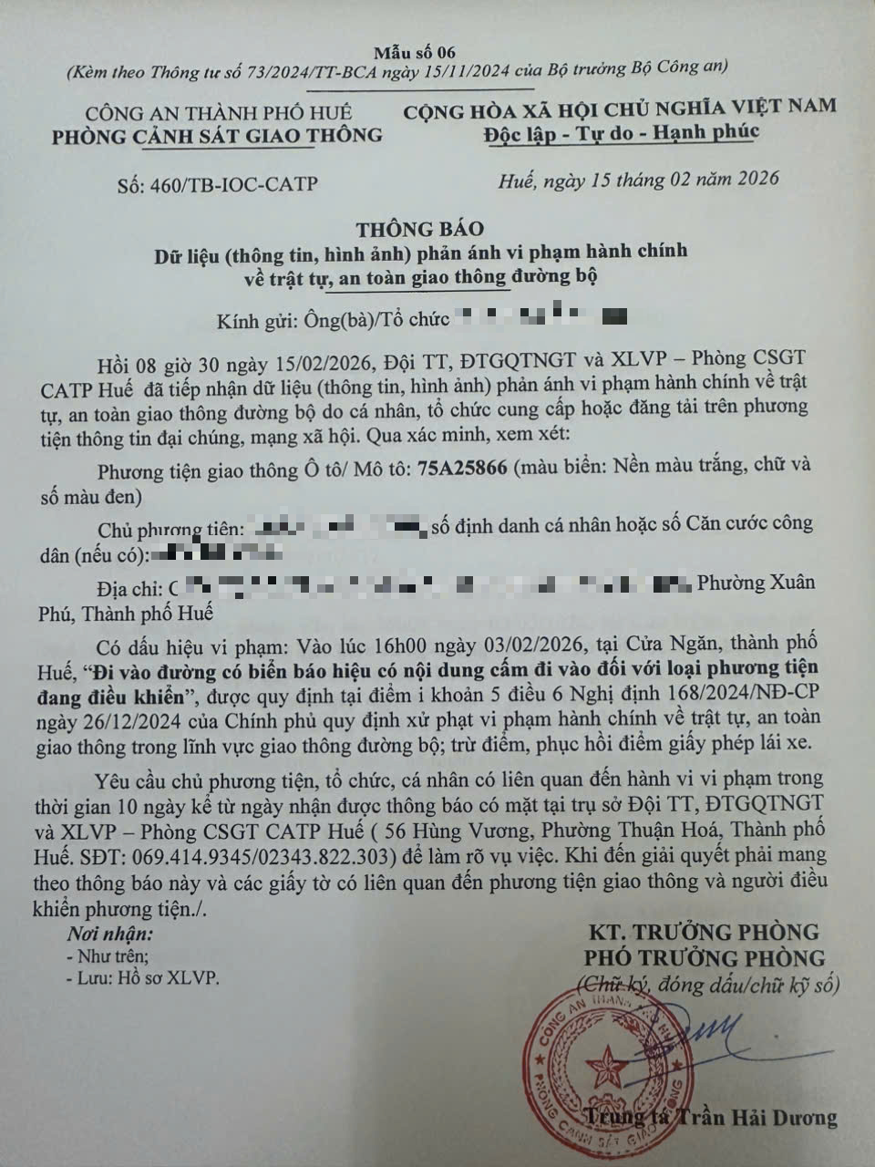 Qua hình ảnh phản ánh, Phòng Cảnh sát giao thông xác định lỗi vi phạm của người điều khiển phương tiện 75A25866 như sau: Đi vào đường có biển báo hiệu có nội dung cấm đi vào đối với loại phương tiện đang điều khiển, được quy định tại Điểm i khoản 5 Điều 6 Nghị định số 168/2024/NĐ-CP ngày 26/12/2024 của Chính phủ.