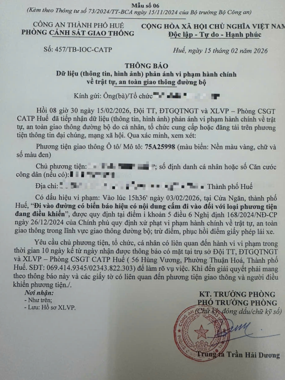 Qua hình ảnh phản ánh, Phòng Cảnh sát giao thông xác định lỗi vi phạm của người điều khiển phương tiện 75A25998 như sau: Đi vào đường có biển báo hiệu có nội dung cấm đi vào đối với loại phương tiện đang điều khiển, được quy định tại Điểm i khoản 5 Điều 6 Nghị định số 168/2024/NĐ-CP ngày 26/12/2024 của Chính phủ.