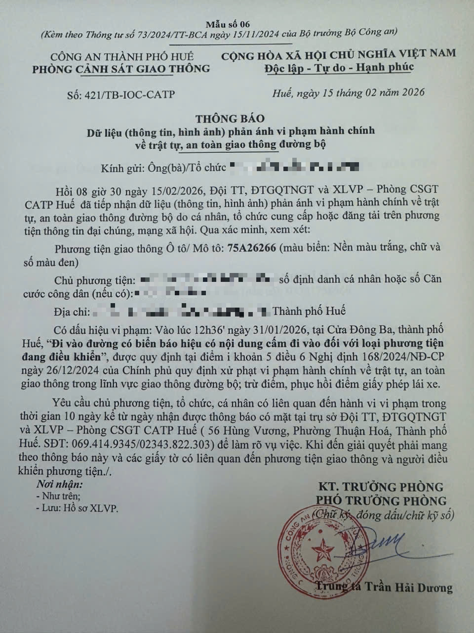 Qua hình ảnh phản ánh, Phòng Cảnh sát giao thông xác định lỗi vi phạm của người điều khiển phương tiện 75A26266 như sau: Đi vào đường có biển báo hiệu có nội dung cấm đi vào đối với loại phương tiện đang điều khiển, được quy định tại Điểm i khoản 5 Điều 6 Nghị định số 168/2024/NĐ-CP ngày 26/12/2024 của Chính phủ.