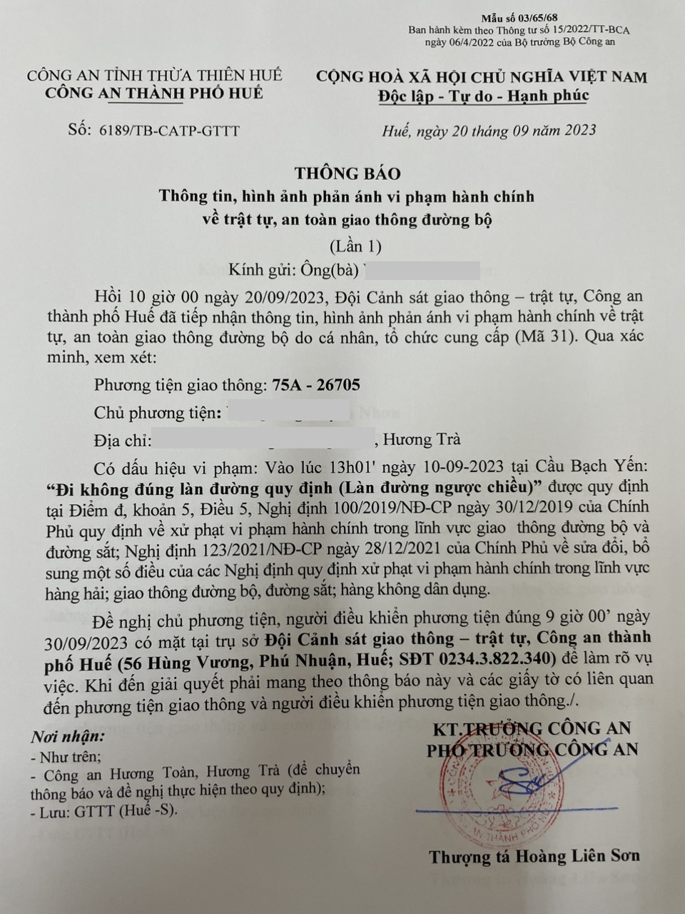 Vào lúc 13 giờ 01 phút, ngày 10/09/2023 ô tô mang biển kiểm soát 75A26705 đi sai làn, lấn tuyến khi tham gia giao thông tại Cầu Bạch Yến (In)