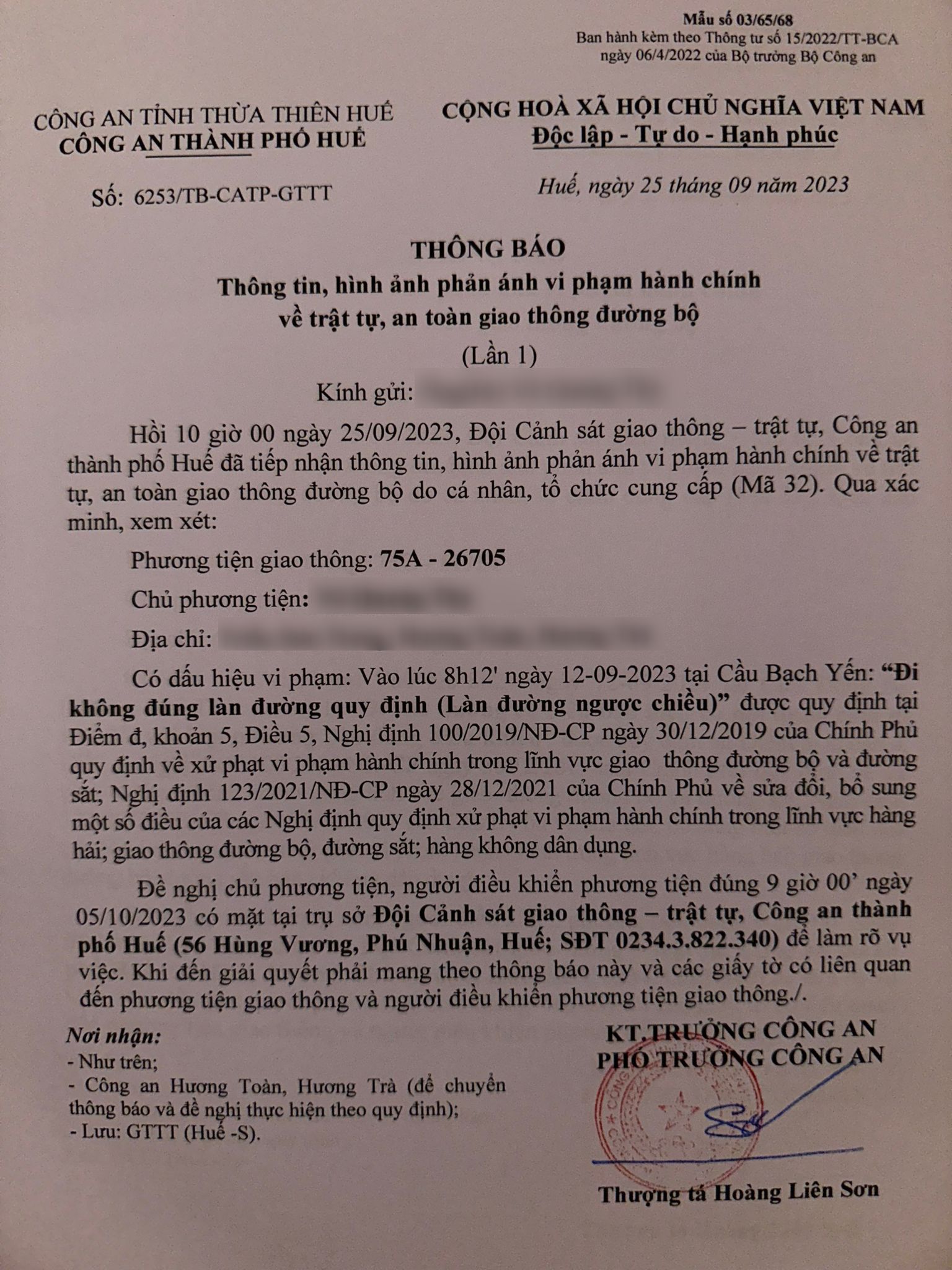 Công an thành phố cập nhật kết quả: Qua xác minh làm việc với chủ phương tiện vi phạm lỗi: Không chấp hành hiệu lệnh, chỉ dẫn của vạch kẻ đường, quy định tại điểm a, khoản 1, điều 5 Nghị định 100/2019/NĐ-CP được sửa đổi, bổ sung tại Nghị định 123/NĐ-CP ngày 28/12/2021. Ra Quyết định xử phạt 350.000đ. (Đính kèm Quyết định)