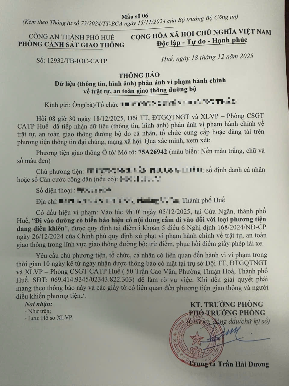 Qua hình ảnh phản ánh, Phòng Cảnh sát giao thông xác định lỗi vi phạm của người điều khiển phương tiện 75A26942 như sau: Đi vào đường có biển báo hiệu có nội dung cấm đi vào đối với loại phương tiện đang điều khiển, được quy định tại Điểm i khoản 5 Điều 6 Nghị định số 168/2024/NĐ-CP ngày 26/12/2024 của Chính phủ.