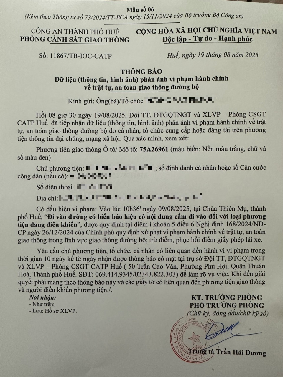 Qua hình ảnh phản ánh, Phòng Cảnh sát giao thông xác định lỗi vi phạm của người điều khiển phương tiện 75A26961 như sau: Đi vào đường có biển báo hiệu có nội dung cấm đi vào đối với loại phương tiện đang điều khiển, được quy định tại Điểm i khoản 5 Điều 6 Nghị định số 168/2024/NĐ-CP ngày 26/12/2024 của Chính phủ.