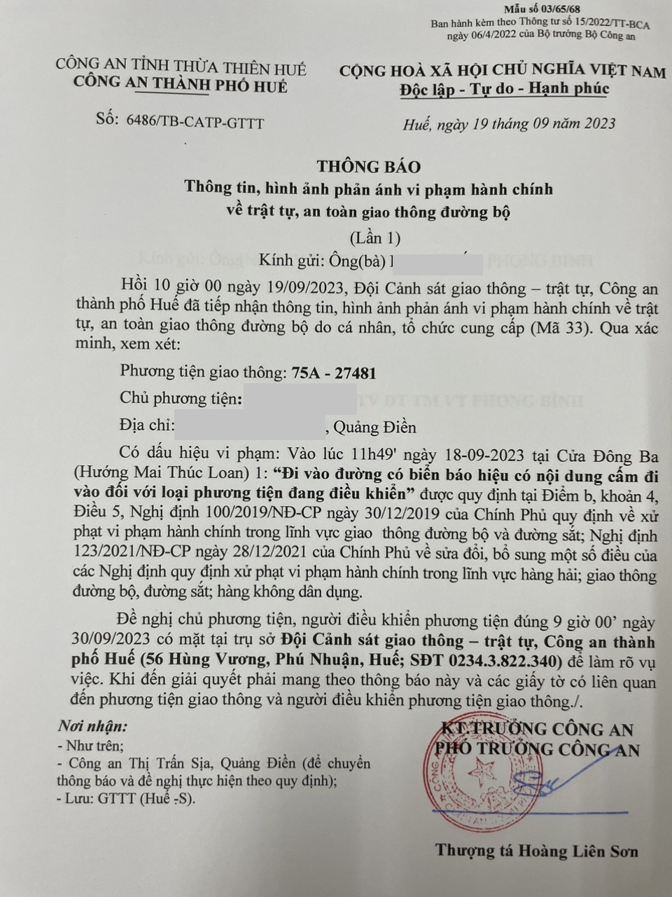 Vào lúc 11 giờ 49 phút, ngày 18/09/2023 ô tô mang biển kiểm soát 75A27481 đi vào đường cấm khi tham gia giao thông tại Cửa Đông Ba (Out) (Hướng Mai Thúc Loan)