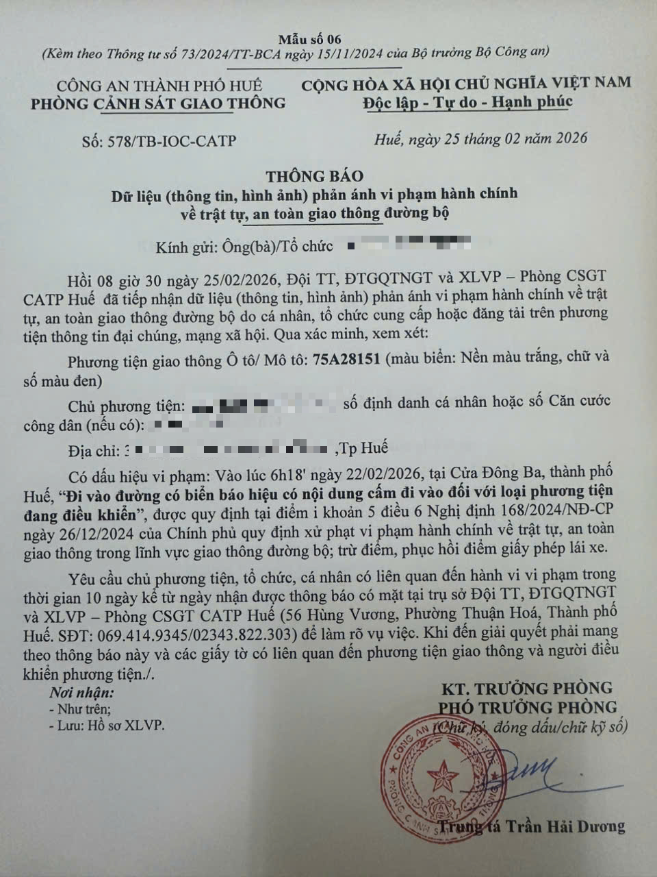 Qua hình ảnh phản ánh, Phòng Cảnh sát giao thông xác định lỗi vi phạm của người điều khiển phương tiện 75A28151 như sau: Đi vào đường có biển báo hiệu có nội dung cấm đi vào đối với loại phương tiện đang điều khiển, được quy định tại Điểm i khoản 5 Điều 6 Nghị định số 168/2024/NĐ-CP ngày 26/12/2024 của Chính phủ.