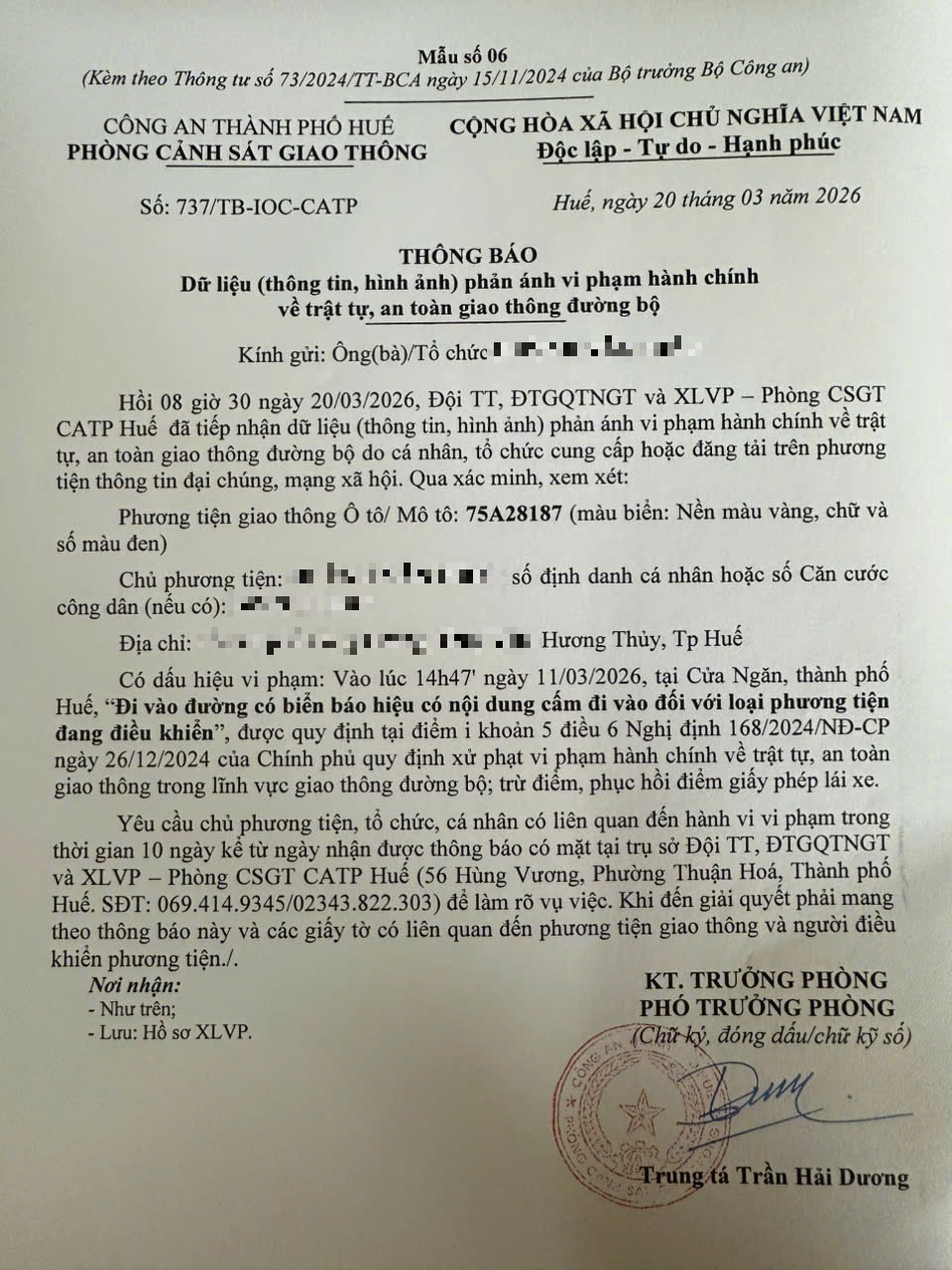Qua hình ảnh phản ánh, Phòng Cảnh sát giao thông xác định lỗi vi phạm của người điều khiển phương tiện 75A28187 như sau: Đi vào đường có biển báo hiệu có nội dung cấm đi vào đối với loại phương tiện đang điều khiển, được quy định tại Điểm i khoản 5 Điều 6 Nghị định số 168/2024/NĐ-CP ngày 26/12/2024 của Chính phủ.