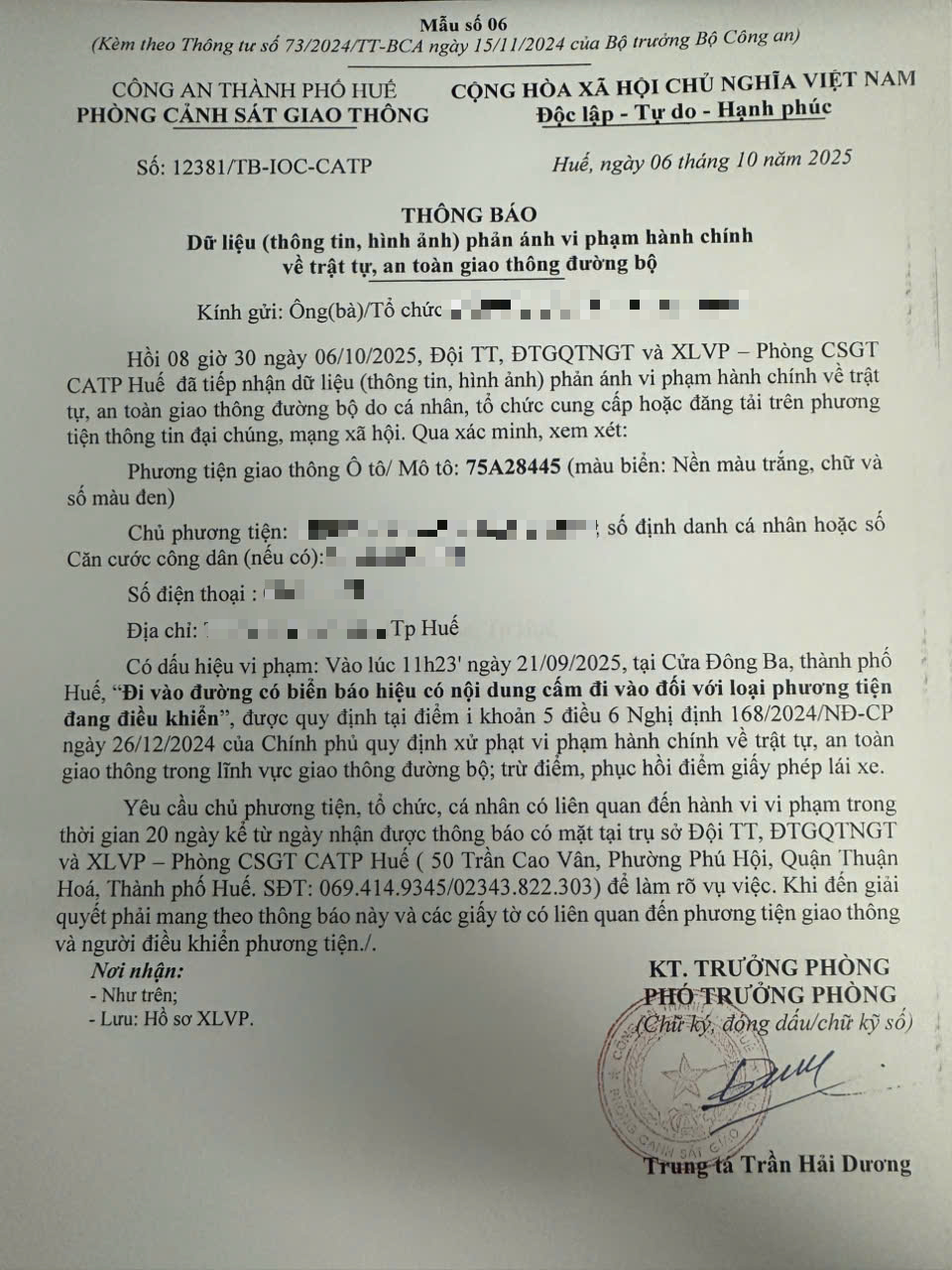 Qua hình ảnh phản ánh, người điều khiển phương tiện BKS 75A28445 có dấu hiệu vi phạm lỗi: Đi vào đường có biển báo hiệu có nội dung cấm đi vào đối với loại phương tiện đang điều khiển, quy định tại điểm i, khoản 5, điều 6 Nghị định số 168/2024/NĐ-CP ngày 26/12/2024 của Chính phủ quy định xử phạt vi phạm hành chính về trật tự, an toàn giao thông trong lĩnh vực giao thông đường bộ; trừ điểm, phục hồi điểm giấy phép lái xe.