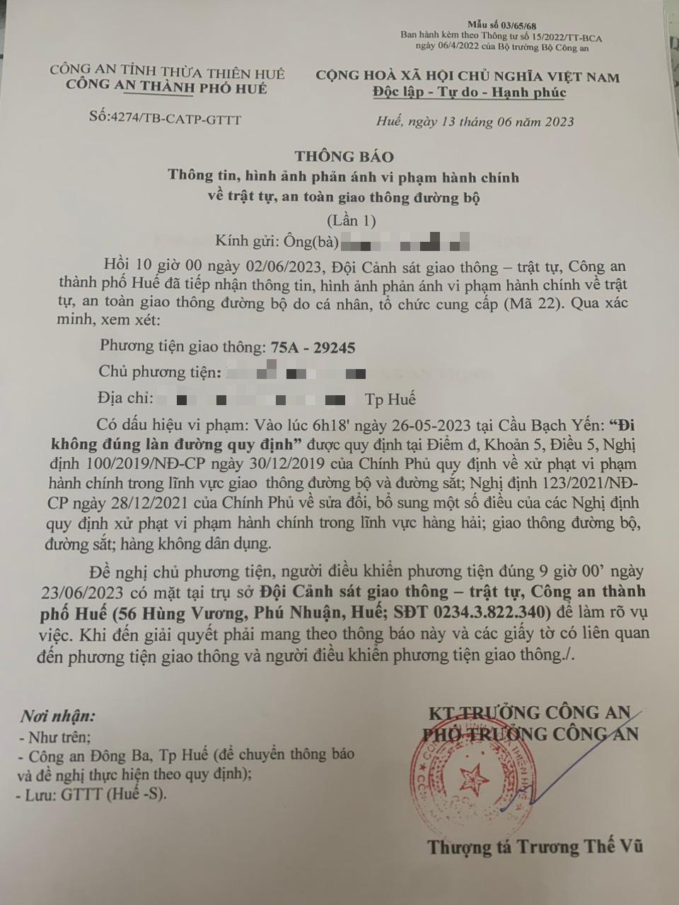 Công an thành phố đã lập hồ sơ, thông báo chủ phương tiện đến làm việc. Tuy nhiên đến nay chủ phương tiện vẫn chưa trình diện tại cơ quan. Hiện Công an thành phố Huế sẽ gửi thông báo phương tiện đến Trung tâm đăng kiểm xe cơ giới Thừa Thiên Huế để đưa vào cảnh báo phương tiện liên quan đến vi phạm hành chính trên chương trình quản lý kiểm định.