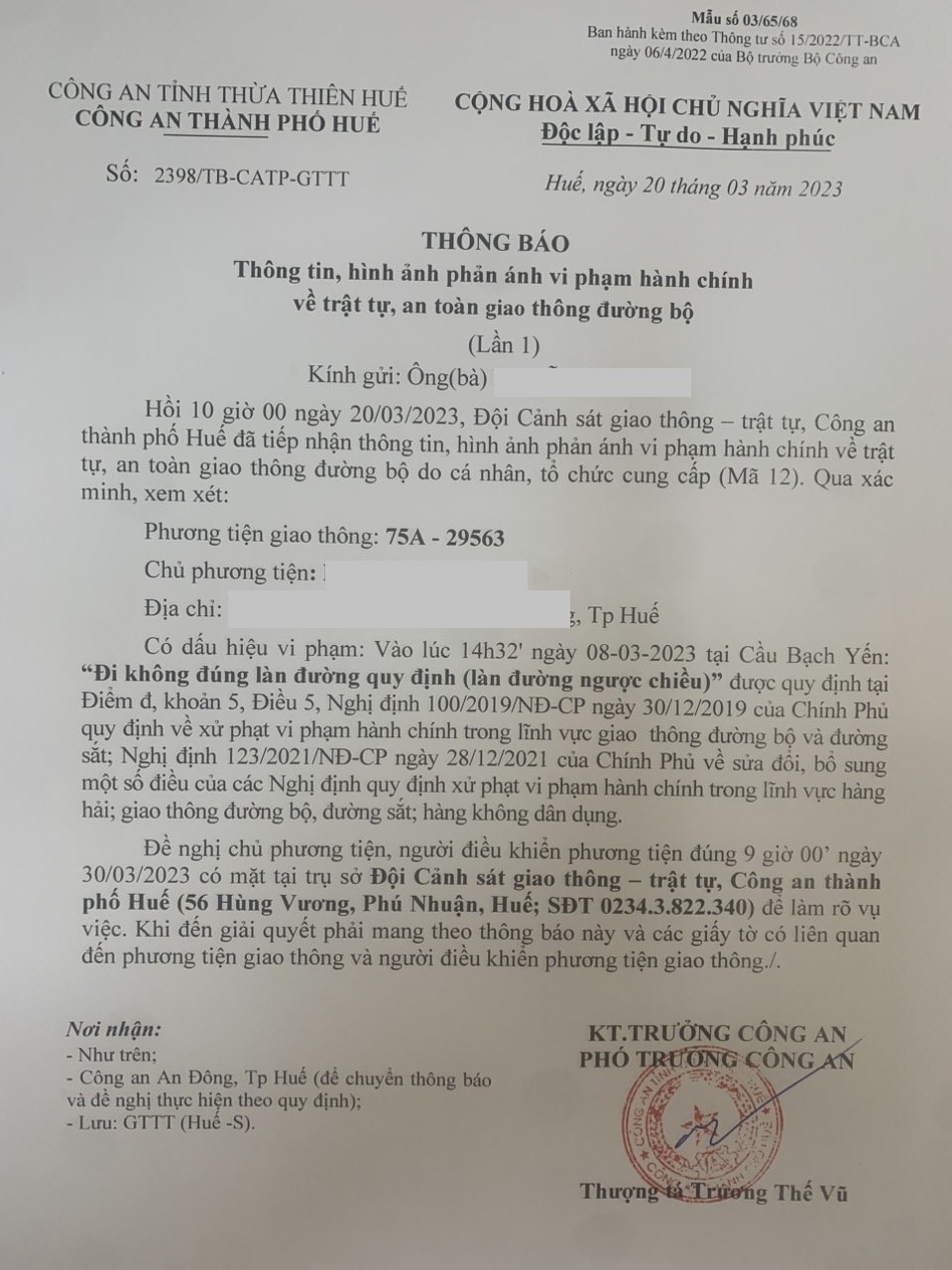Vấn đề quý Ông/Bà phản ánh, Công an tỉnh đã chỉ đạo Công an thành phố Huế kiểm tra và xin thông báo kết quả xử lý như sau: