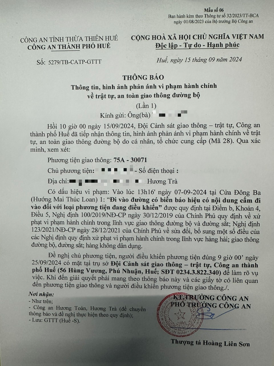 Ngay sau khi nhận được phản ánh, Công an thành phố đã chỉ đạo Đội CSGT-TT xác minh, gởi thông báo yêu cầu chủ phương tiện đến làm việc theo quy định của pháp luật. Tuy nhiên đến nay chủ phương tiện vẫn chưa trình diện tại cơ quan. Hiện Công an thành phố Huế sẽ gửi thông báo phương tiện đến Trung tâm đăng kiểm xe cơ giới Thừa Thiên Huế để đưa vào cảnh báo phương tiện liên quan đến vi phạm hành chính trên chương trình quản lý kiểm định (Căn cứ Luật Xử lý vi phạm hành chính năm 2012; Nghị định 100/2019/NĐ-CP ngày 30/12/2019 của Chính Phủ quy định về xử phạt vi phạm hành chính trong lĩnh vực giao thông đường bộ và đường sắt; Nghị định 123/2021/NĐ-CP ngày 28/12/2021 của Chính Phủ về sửa đổi, bổ sung một số điều của các Nghị định quy định xử phạt vi phạm hành chính trong lĩnh vực hàng hải; giao thông đường bộ, đường sắt; hàng không dân dụng.; Quyết định số 2498/QĐ-UBND).