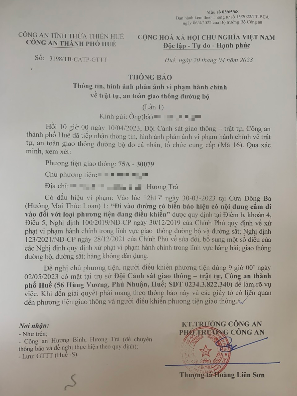 Vấn đề quý Ông/Bà phản ánh, Công an tỉnh đã chỉ đạo Công an thành phố Huế kiểm tra và xin thông báo kết quả xử lý như sau: