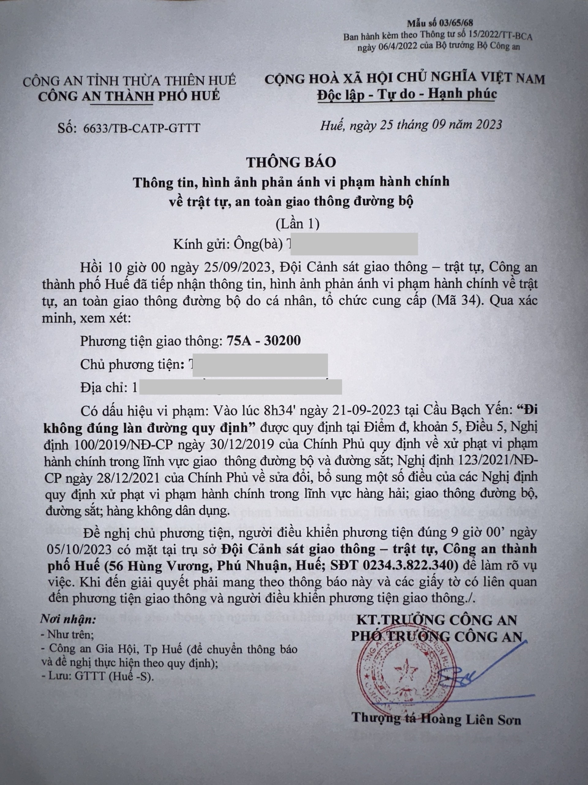 Công an thành phố cập nhật kết quả: Qua xác minh làm việc với chủ phương tiện vi phạm lỗi: Không chấp hành hiệu lệnh, chỉ dẫn của vạch kẻ đường, quy định tại điểm a, khoản 1, điều 5 Nghị định 100/2019/NĐ-CP được sửa đổi, bổ sung tại Nghị định 123/NĐ-CP ngày 28/12/2021. Ra Quyết định xử phạt 350.000đ. (Đính kèm Quyết định)