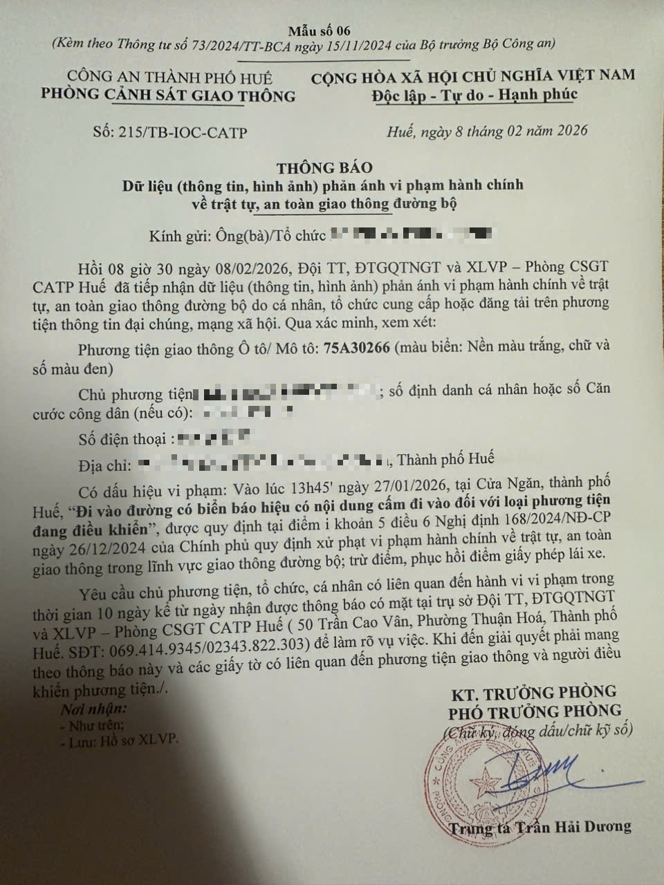 Qua hình ảnh phản ánh, người điều khiển phương tiện BKS 75A30266 có dấu hiệu vi phạm lỗi: Đi vào đường có biển báo hiệu có nội dung cấm đi vào đối với loại phương tiện đang điều khiển, quy định tại điểm i, khoản 5, điều 6 Nghị định số 168/2024/NĐ-CP ngày 26/12/2024 của Chính phủ quy định xử phạt vi phạm hành chính về trật tự, an toàn giao thông trong lĩnh vực giao thông đường bộ; trừ điểm, phục hồi điểm giấy phép lái xe.