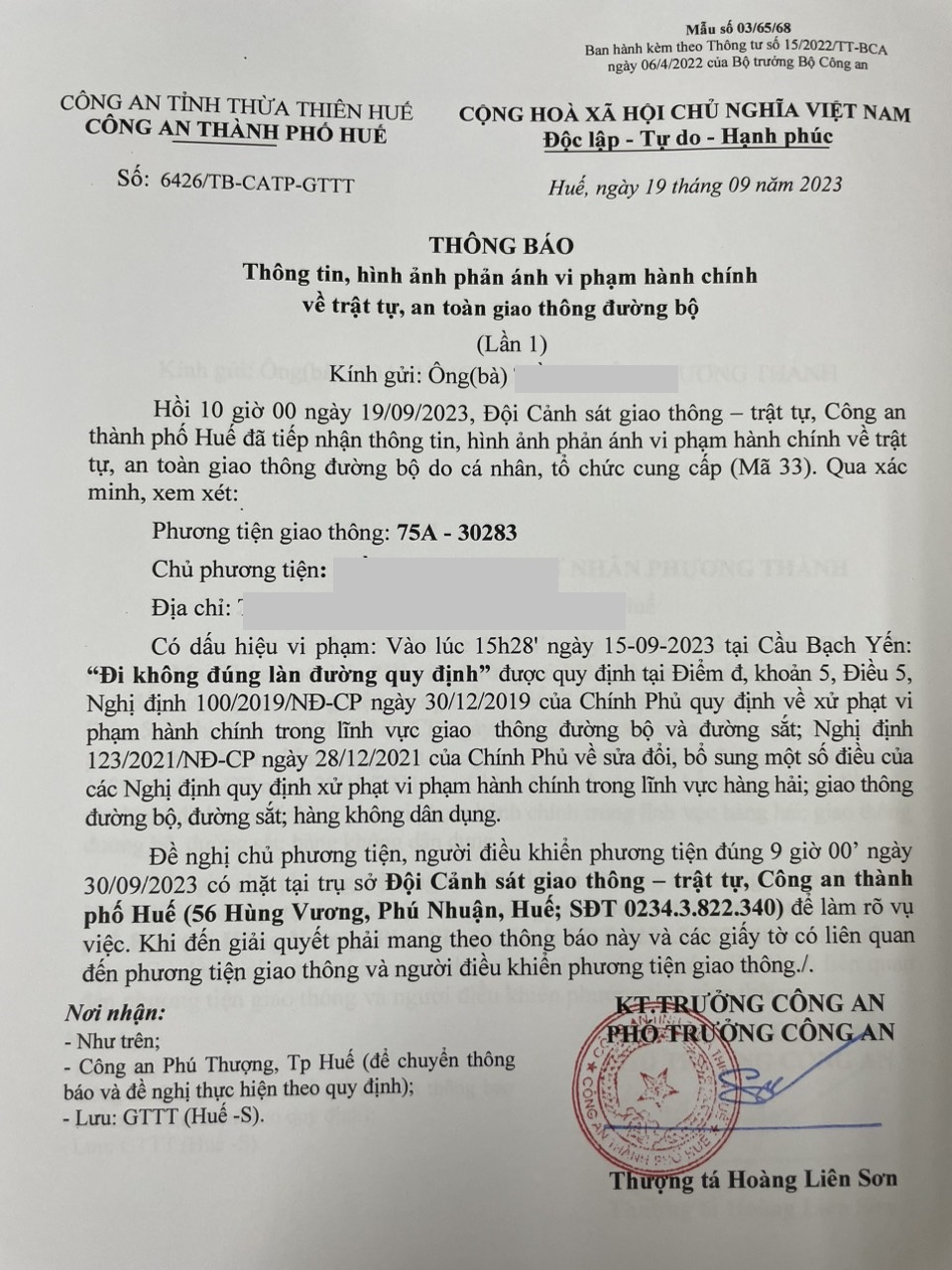 Công an thành phố cập nhật kết quả: Qua xác minh làm việc với chủ phương tiện vi phạm lỗi: Không chấp hành hiệu lệnh, chỉ dẫn của vạch kẻ đường, quy định tại điểm a, khoản 1, điều 5 Nghị định 100/2019/NĐ-CP được sửa đổi, bổ sung tại Nghị định 123/NĐ-CP ngày 28/12/2021. Ra Quyết định xử phạt 350.000đ. (Đính kèm Quyết định)