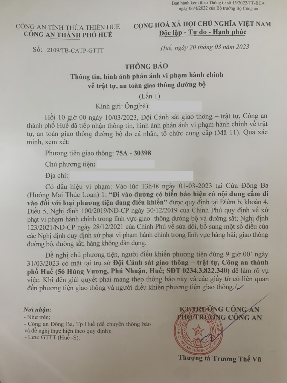 Công an thành phố đã lập hồ sơ, thông báo chủ phương tiện đến làm việc vào ngày 31/3/2023. Nếu đến ngày hẹn, chủ phương tiện vẫn chưa trình diện tại cơ quan. Công an thành phố sẽ gửi thông báo cho cơ quan đăng kiểm để đưa phương tiện vào cảnh báo trên Chương trình Quản lý kiểm định.