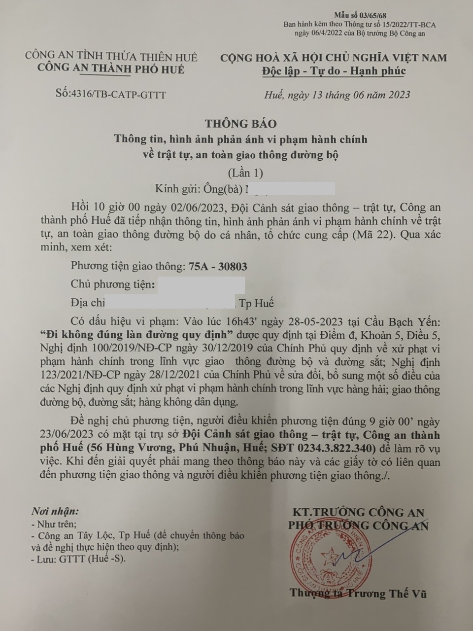 Công an thành phố cập nhật kết quả: Qua xác minh làm việc với chủ phương tiện vi phạm lỗi: Không chấp hành hiệu lệnh, chỉ dẫn của vạch kẻ đường, quy định tại điểm a, khoản 1, điều 5 Nghị định 100/2019/NĐ-CP được sửa đổi, bổ sung tại Nghị định 123/NĐ-CP ngày 28/12/2021. Ra Quyết định xử phạt 350.000đ. (Đính kèm Quyết định)