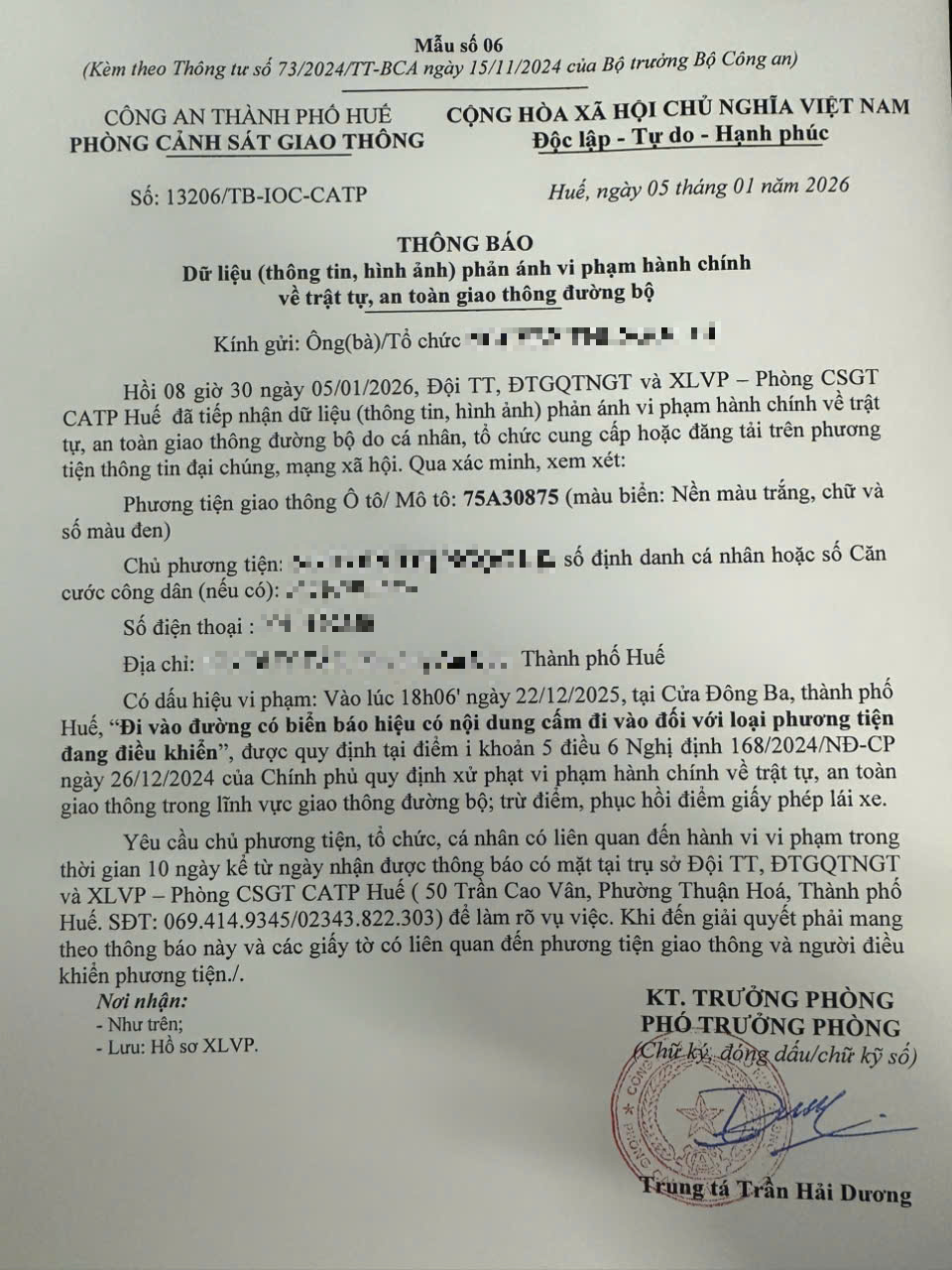 Qua hình ảnh phản ánh, Phòng Cảnh sát giao thông xác định lỗi vi phạm của người điều khiển phương tiện 75A30875 như sau: Đi vào đường có biển báo hiệu có nội dung cấm đi vào đối với loại phương tiện đang điều khiển, được quy định tại Điểm i khoản 5 Điều 6 Nghị định số 168/2024/NĐ-CP ngày 26/12/2024 của Chính phủ.