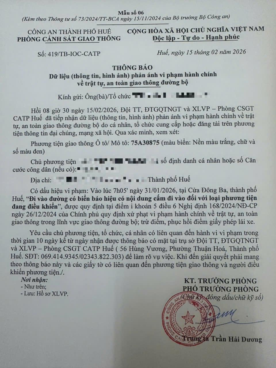 Qua hình ảnh phản ánh, Phòng Cảnh sát giao thông xác định lỗi vi phạm của người điều khiển phương tiện 75A30875 như sau: Đi vào đường có biển báo hiệu có nội dung cấm đi vào đối với loại phương tiện đang điều khiển, được quy định tại Điểm i khoản 5 Điều 6 Nghị định số 168/2024/NĐ-CP ngày 26/12/2024 của Chính phủ.
