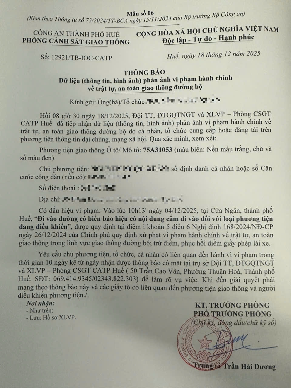 Qua hình ảnh phản ánh, Phòng Cảnh sát giao thông xác định lỗi vi phạm của người điều khiển phương tiện 75A31053 như sau: Đi vào đường có biển báo hiệu có nội dung cấm đi vào đối với loại phương tiện đang điều khiển, được quy định tại Điểm i khoản 5 Điều 6 Nghị định số 168/2024/NĐ-CP ngày 26/12/2024 của Chính phủ.