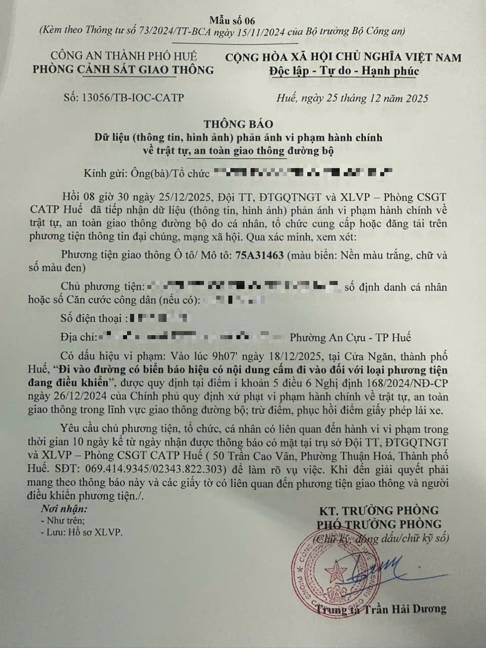 Qua hình ảnh phản ánh, Phòng Cảnh sát giao thông xác định lỗi vi phạm của người điều khiển phương tiện 75A31463 như sau: Đi vào đường có biển báo hiệu có nội dung cấm đi vào đối với loại phương tiện đang điều khiển, được quy định tại Điểm i khoản 5 Điều 6 Nghị định số 168/2024/NĐ-CP ngày 26/12/2024 của Chính phủ.