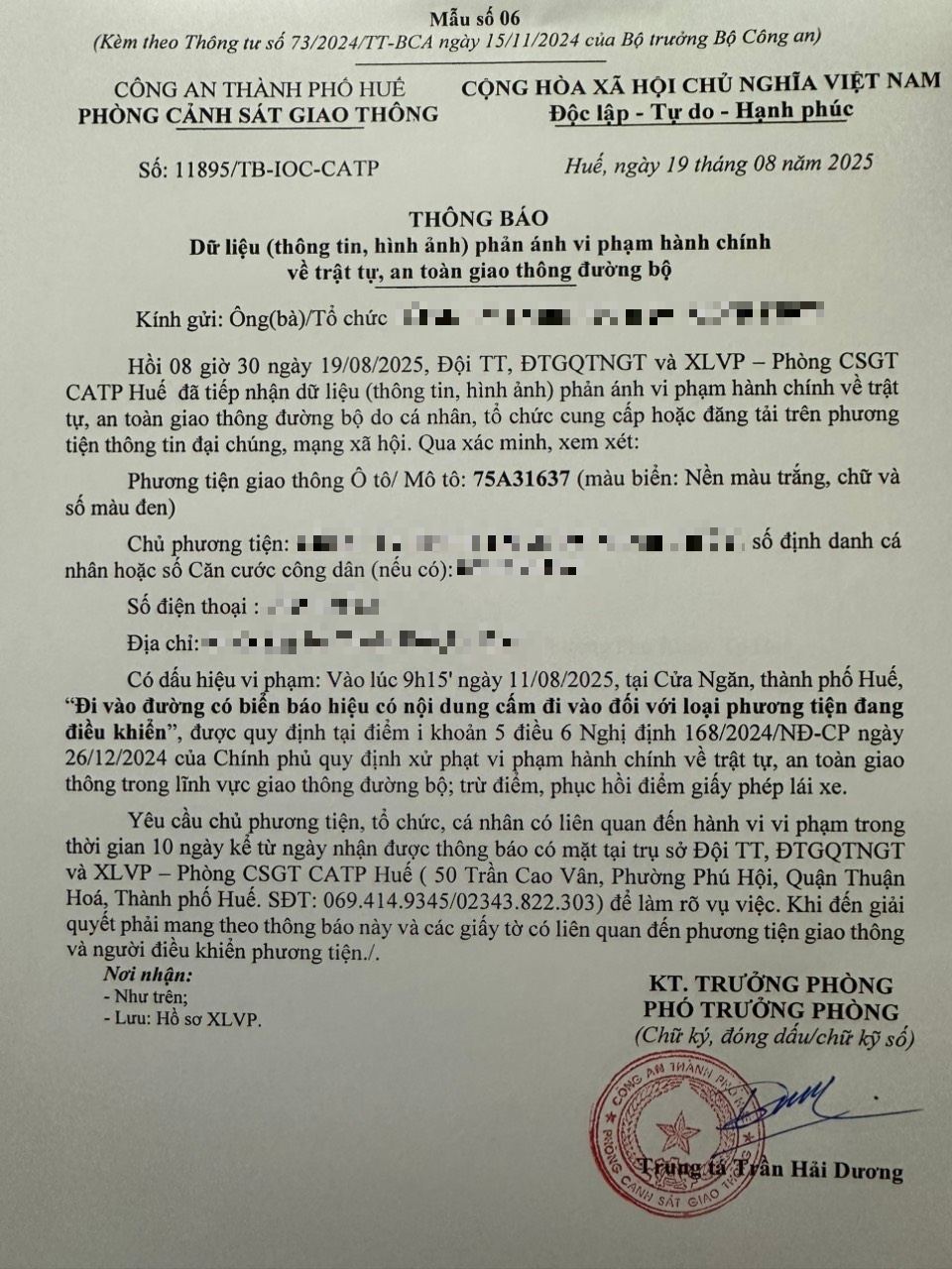 Qua hình ảnh phản ánh, Phòng Cảnh sát giao thông xác định lỗi vi phạm của người điều khiển phương tiện 75A31637 như sau: Đi vào đường có biển báo hiệu có nội dung cấm đi vào đối với loại phương tiện đang điều khiển, được quy định tại Điểm i khoản 5 Điều 6 Nghị định số 168/2024/NĐ-CP ngày 26/12/2024 của Chính phủ.