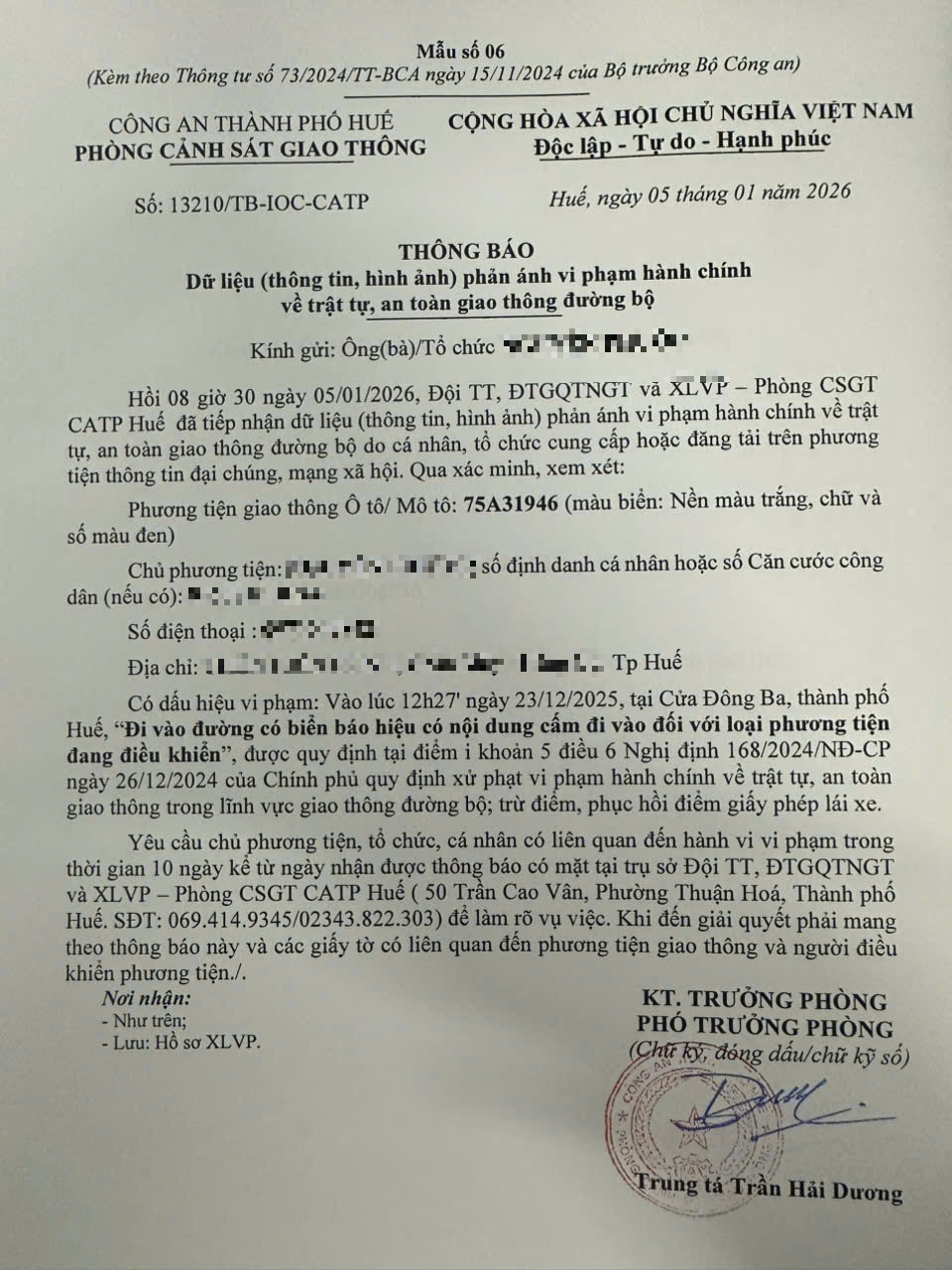 Qua hình ảnh phản ánh, Phòng Cảnh sát giao thông xác định lỗi vi phạm của người điều khiển phương tiện 75A31946 như sau: Đi vào đường có biển báo hiệu có nội dung cấm đi vào đối với loại phương tiện đang điều khiển, được quy định tại Điểm i khoản 5 Điều 6 Nghị định số 168/2024/NĐ-CP ngày 26/12/2024 của Chính phủ.