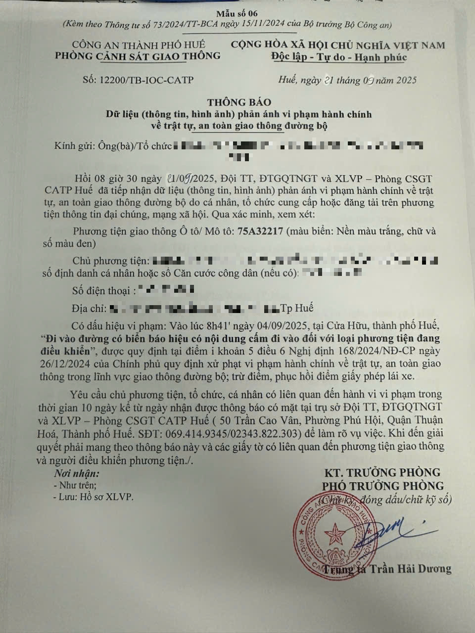 Qua hình ảnh phản ánh, người điều khiển phương tiện BKS 75A32217 có dấu hiệu vi phạm lỗi: Đi vào đường có biển báo hiệu có nội dung cấm đi vào đối với loại phương tiện đang điều khiển, quy định tại điểm i, khoản 5, điều 6 Nghị định số 168/2024/NĐ-CP ngày 26/12/2024 của Chính phủ quy định xử phạt vi phạm hành chính về trật tự, an toàn giao thông trong lĩnh vực giao thông đường bộ; trừ điểm, phục hồi điểm giấy phép lái xe.