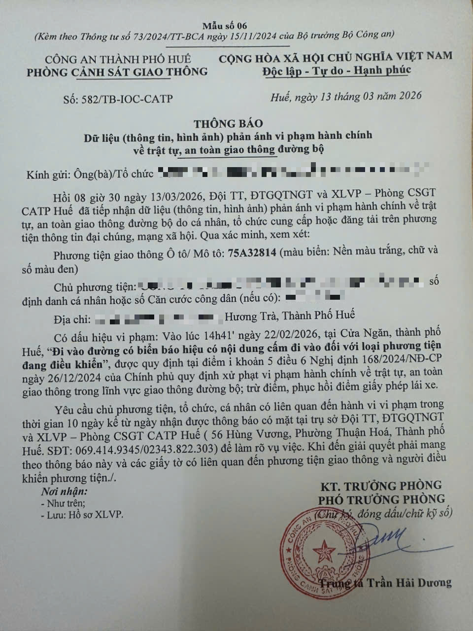 Qua hình ảnh phản ánh, Phòng Cảnh sát giao thông xác định lỗi vi phạm của người điều khiển phương tiện 75A32814 như sau: Đi vào đường có biển báo hiệu có nội dung cấm đi vào đối với loại phương tiện đang điều khiển, được quy định tại Điểm i khoản 5 Điều 6 Nghị định số 168/2024/NĐ-CP ngày 26/12/2024 của Chính phủ.