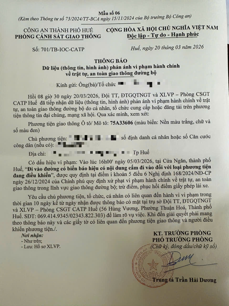 Qua hình ảnh phản ánh, Phòng Cảnh sát giao thông xác định lỗi vi phạm của người điều khiển phương tiện 75A33606 như sau: “Đi vào đường có biển báo hiệu có nội dung cấm đi vào đối với loại phương tiện đang điều khiển”, quy định tại điểm i, khoản 5, điều 6 Nghị định 168/2024/NĐ-CP.