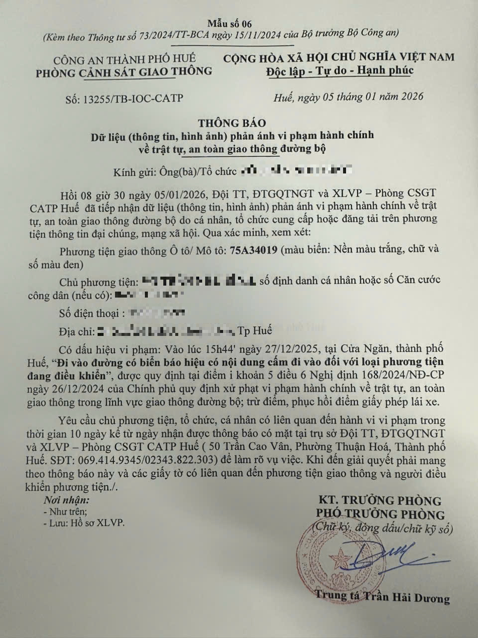 Qua hình ảnh phản ánh, Phòng Cảnh sát giao thông xác định lỗi vi phạm của người điều khiển phương tiện 75A34019 như sau: Đi vào đường có biển báo hiệu có nội dung cấm đi vào đối với loại phương tiện đang điều khiển, được quy định tại Điểm i khoản 5 Điều 6 Nghị định số 168/2024/NĐ-CP ngày 26/12/2024 của Chính phủ.