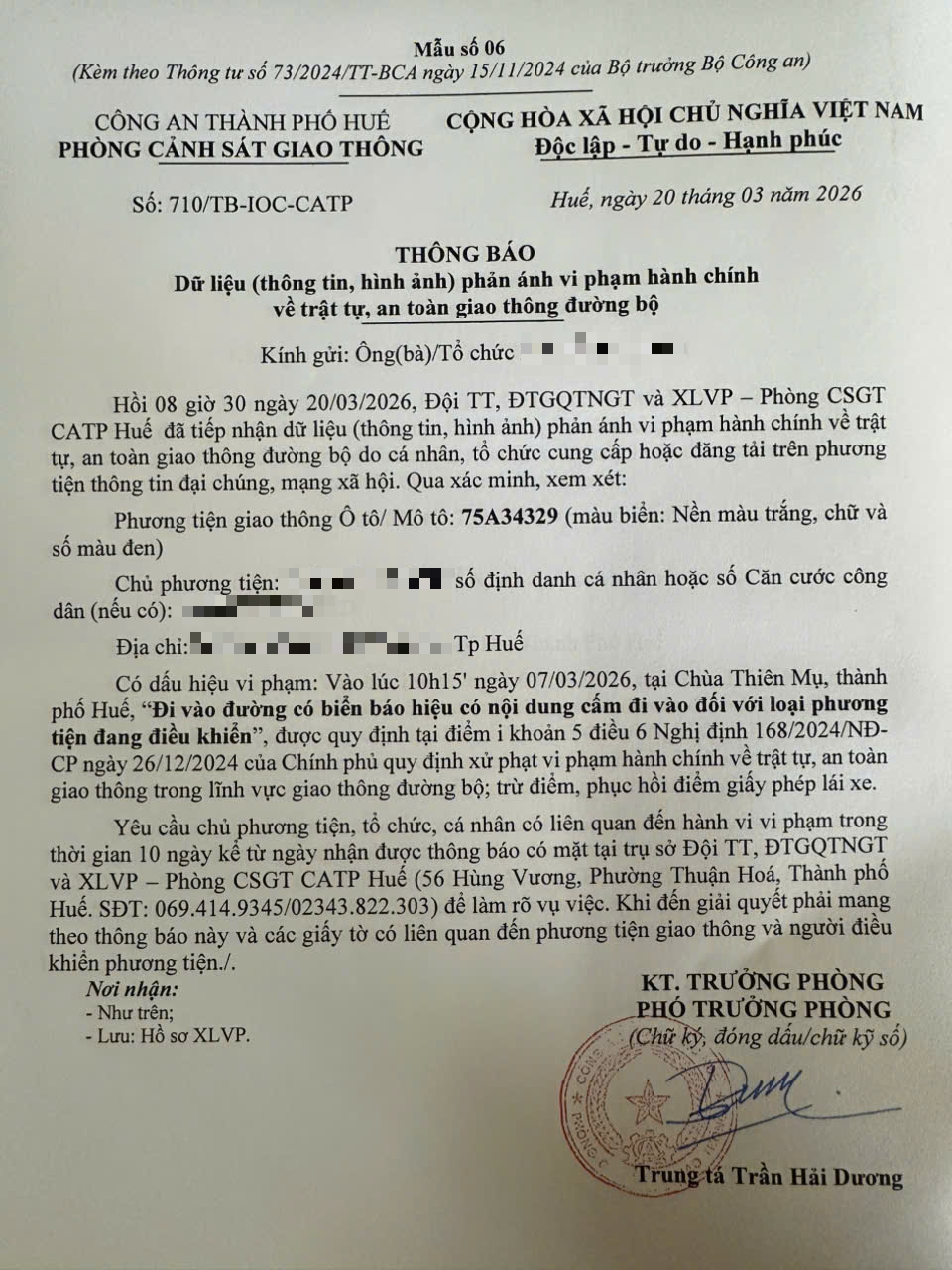 Qua hình ảnh phản ánh, Phòng Cảnh sát giao thông xác định lỗi vi phạm của người điều khiển phương tiện 75A34329 như sau: “Đi vào đường có biển báo hiệu có nội dung cấm đi vào đối với loại phương tiện đang điều khiển”, quy định tại điểm i, khoản 5, điều 6 Nghị định 168/2024/NĐ-CP.
