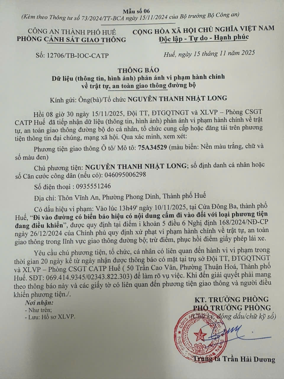 Vấn đề quý Ông/Bà phản ánh, Phòng Cảnh sát giao thông – Công an thành phố Huế đã kiểm tra và xin thông báo kết quả như sau: