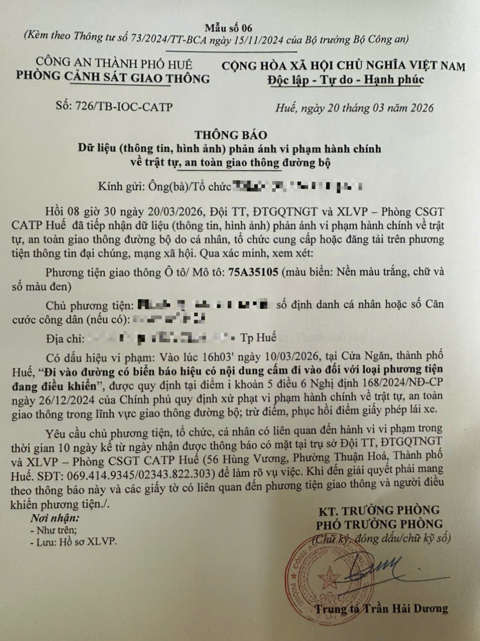 Vấn đề quý Ông/Bà phản ánh, Công an thành phố Huế đã chỉ đạo Phòng Cảnh sát giao thông kiểm tra và trả lời như sau: