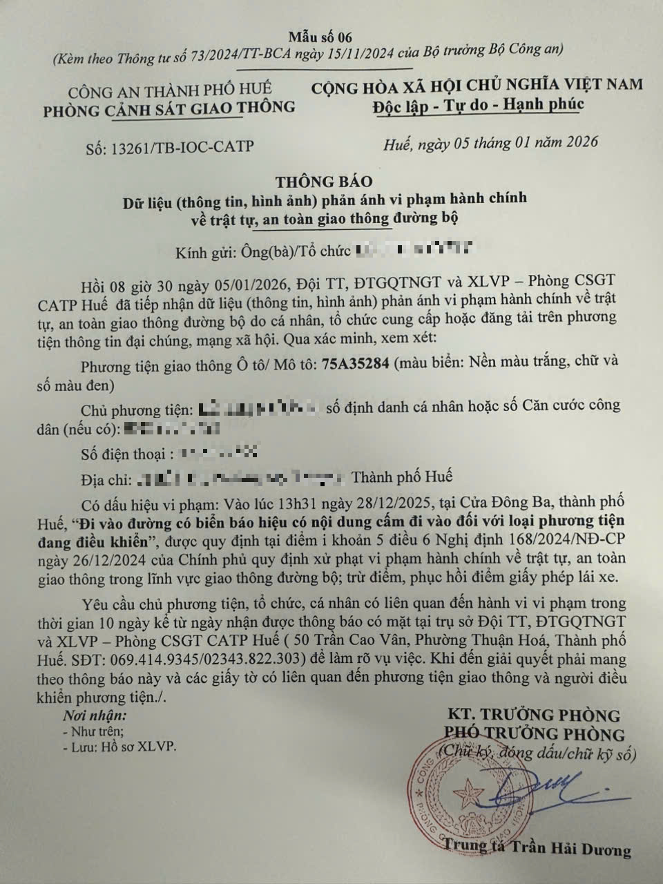 Qua hình ảnh phản ánh, Phòng Cảnh sát giao thông xác định lỗi vi phạm của người điều khiển phương tiện 75A35284 như sau: Đi vào đường có biển báo hiệu có nội dung cấm đi vào đối với loại phương tiện đang điều khiển, được quy định tại Điểm i khoản 5 Điều 6 Nghị định số 168/2024/NĐ-CP ngày 26/12/2024 của Chính phủ.