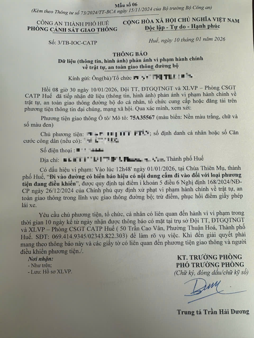 Qua hình ảnh phản ánh, Phòng Cảnh sát giao thông xác định lỗi vi phạm của người điều khiển phương tiện 75A35567 như sau: Đi vào đường có biển báo hiệu có nội dung cấm đi vào đối với loại phương tiện đang điều khiển, được quy định tại Điểm i khoản 5 Điều 6 Nghị định số 168/2024/NĐ-CP ngày 26/12/2024 của Chính phủ.