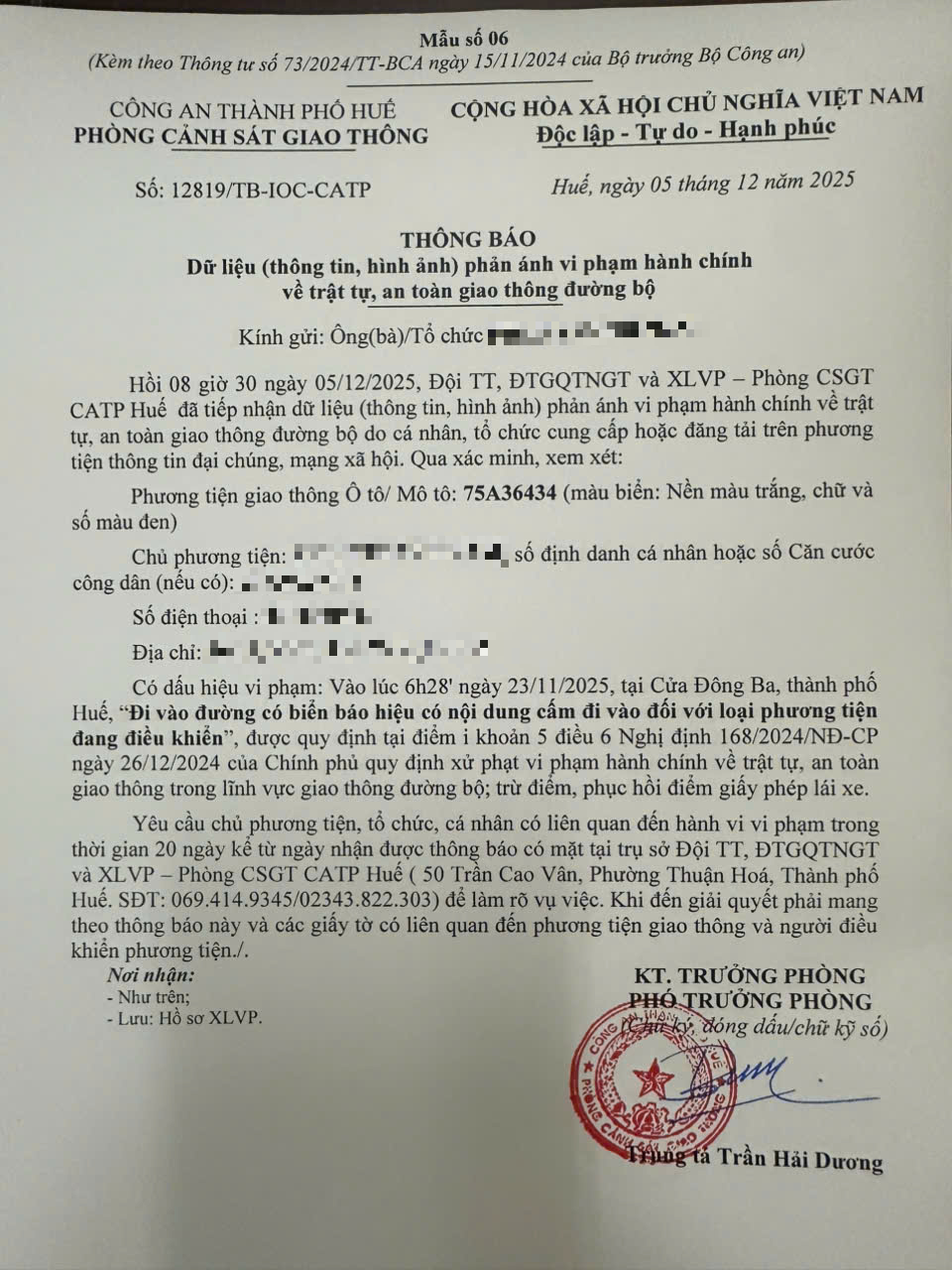 Qua hình ảnh phản ánh, Phòng Cảnh sát giao thông xác định lỗi vi phạm của người điều khiển phương tiện 75A36434 như sau: Đi vào đường có biển báo hiệu có nội dung cấm đi vào đối với loại phương tiện đang điều khiển, được quy định tại Điểm i khoản 5 Điều 6 Nghị định số 168/2024/NĐ-CP ngày 26/12/2024 của Chính phủ.