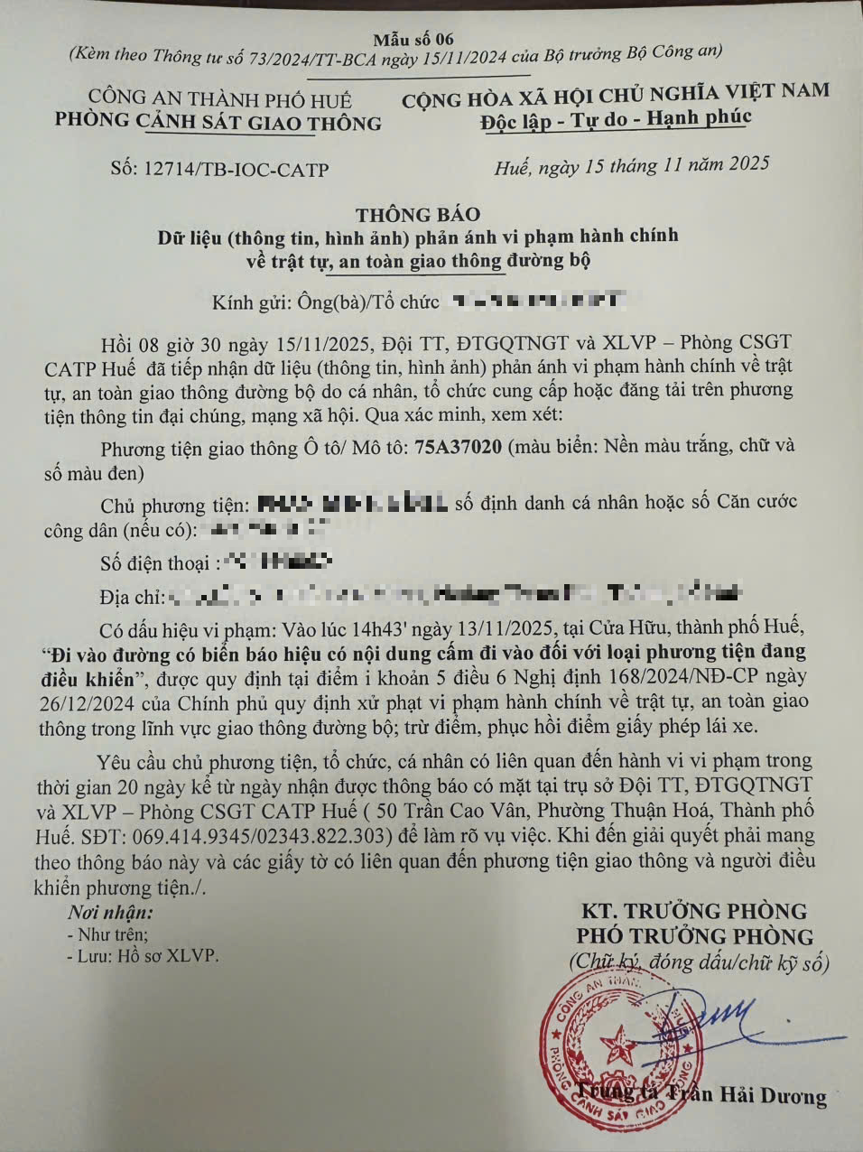 Vấn đề quý Ông/Bà phản ánh, Phòng Cảnh sát giao thông – Công an thành phố Huế đã kiểm tra và xin thông báo kết quả như sau: