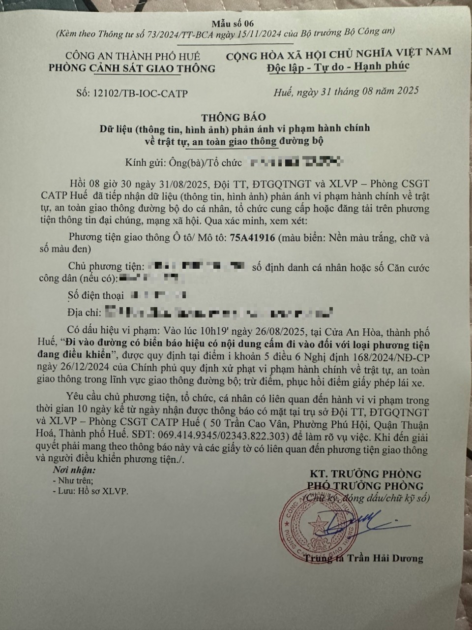 Qua hình ảnh phản ánh, Phòng Cảnh sát giao thông xác định lỗi vi phạm của người điều khiển phương tiện 75A41916 như sau: Đi vào đường có biển báo hiệu có nội dung cấm đi vào đối với loại phương tiện đang điều khiển, được quy định tại Điểm i khoản 5 Điều 6 Nghị định số 168/2024/NĐ-CP ngày 26/12/2024 của Chính phủ.