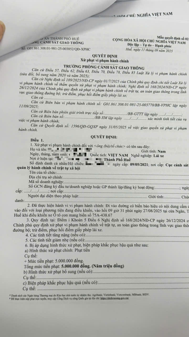 Phòng Cảnh sát giao thông đã xác minh, làm việc với chủ phương tiện 75A43867. Tại cơ quan, chủ phương tiện đã xem hình ảnh, công nhận vi phạm lỗi: Đi vào đường có biển báo hiệu có nội dung cấm đi vào đối với loại phương tiện đang điều khiển, quy định tại điểm i, khoản 5, điều 6 Nghị định số 168/2024/NĐ-CP ngày 26/12/2024 của Chính phủ, đồng thời cam kết không tái phạm.