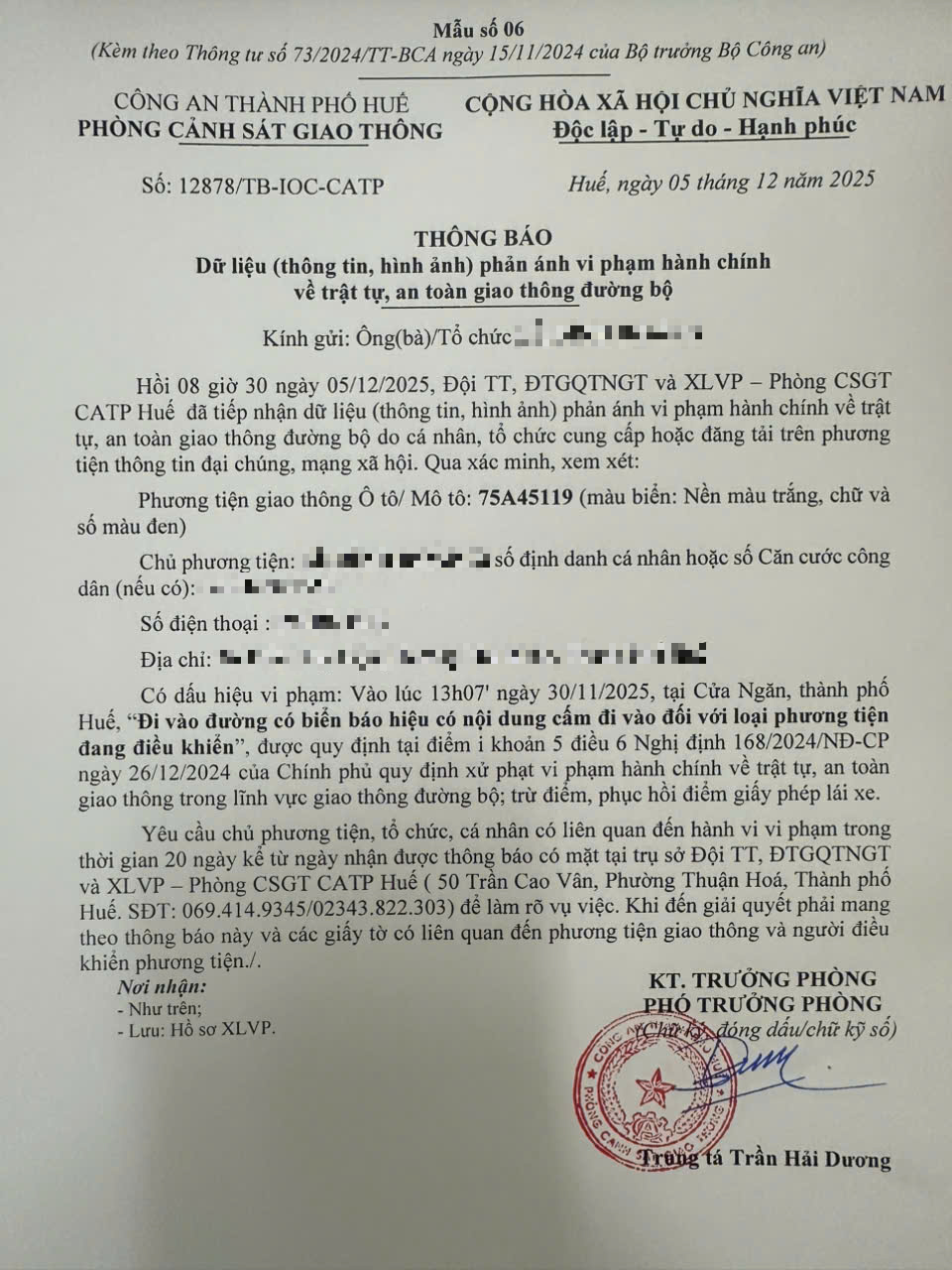 Qua hình ảnh phản ánh, Phòng Cảnh sát giao thông xác định lỗi vi phạm của người điều khiển phương tiện 75A45119 như sau: Đi vào đường có biển báo hiệu có nội dung cấm đi vào đối với loại phương tiện đang điều khiển, được quy định tại Điểm i khoản 5 Điều 6 Nghị định số 168/2024/NĐ-CP ngày 26/12/2024 của Chính phủ.