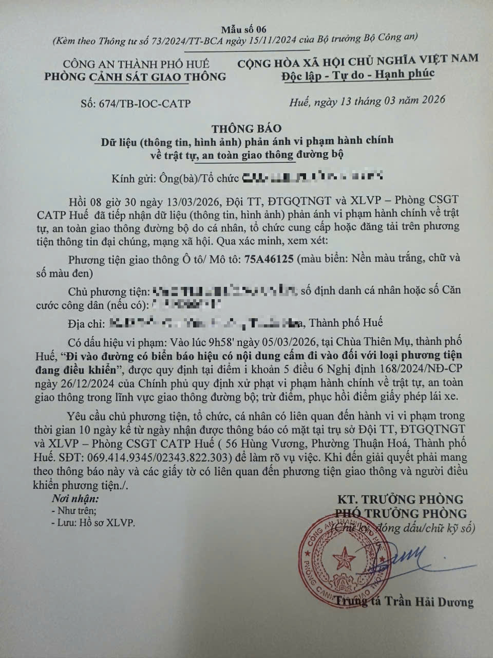 Vấn đề quý Ông/Bà phản ánh, Phòng Cảnh sát giao thông – Công an thành phố Huế đã kiểm trả và xin thông báo kết quả như sau: