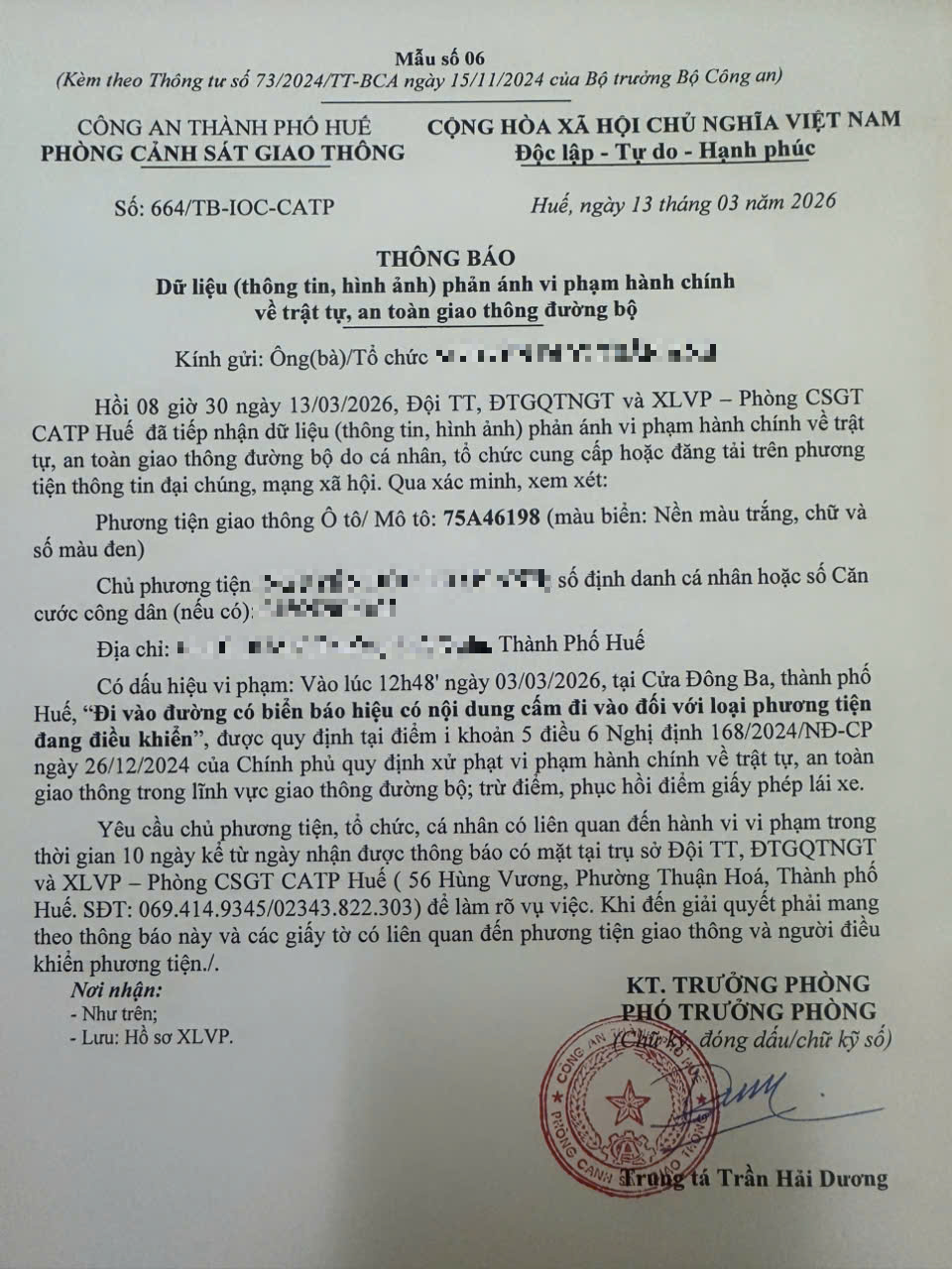 Qua hình ảnh phản ánh, Phòng Cảnh sát giao thông xác định lỗi vi phạm của người điều khiển phương tiện 75A46198 như sau: “Đi vào đường có biển báo hiệu có nội dung cấm đi vào đối với loại phương tiện đang điều khiển”, quy định tại điểm i, khoản 5, điều 6 Nghị định 168/2024/NĐ-CP.