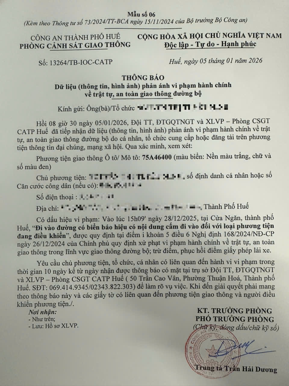 Qua hình ảnh phản ánh, Phòng Cảnh sát giao thông xác định lỗi vi phạm của người điều khiển phương tiện 75A46400 như sau: Đi vào đường có biển báo hiệu có nội dung cấm đi vào đối với loại phương tiện đang điều khiển, được quy định tại Điểm i khoản 5 Điều 6 Nghị định số 168/2024/NĐ-CP ngày 26/12/2024 của Chính phủ.