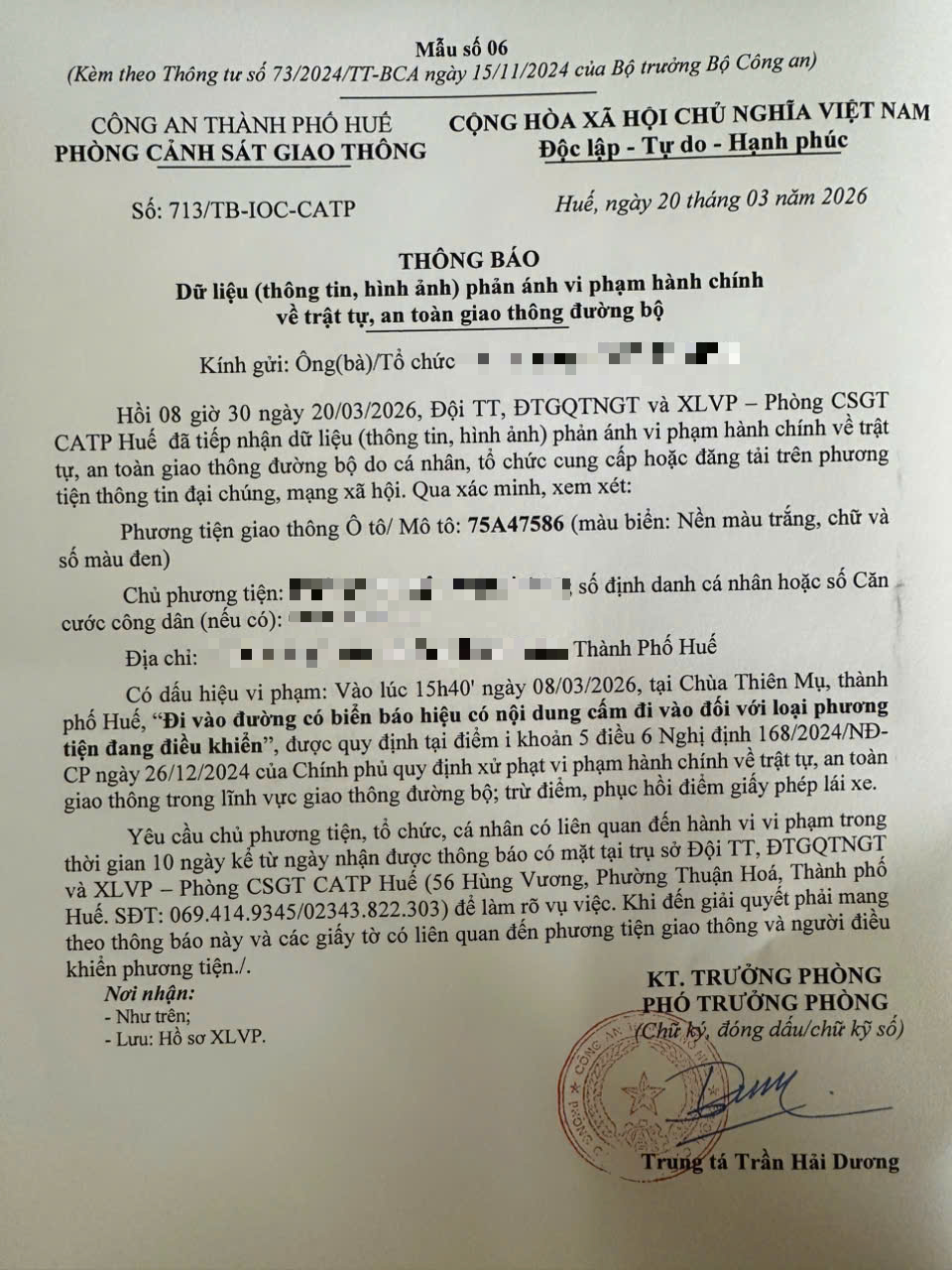 Qua hình ảnh phản ánh, Phòng Cảnh sát giao thông xác định lỗi vi phạm của người điều khiển phương tiện 75A47586 như sau: “Đi vào đường có biển báo hiệu có nội dung cấm đi vào đối với loại phương tiện đang điều khiển”, quy định tại điểm i, khoản 5, điều 6 Nghị định 168/2024/NĐ-CP.