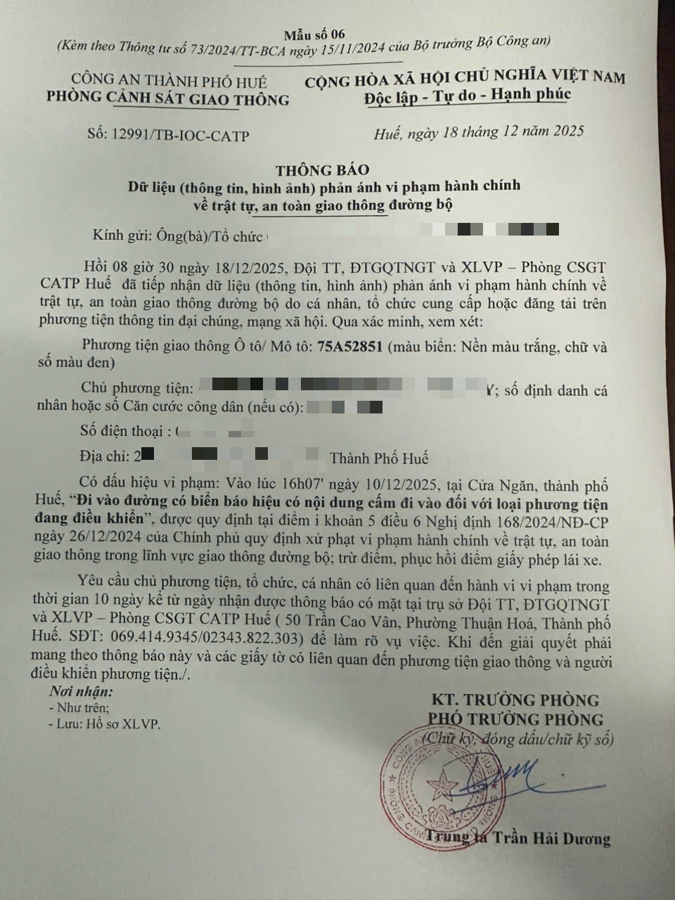 Qua hình ảnh phản ánh, Phòng Cảnh sát giao thông xác định lỗi vi phạm của người điều khiển phương tiện 75A52851: Đi vào đường có biển báo hiệu có nội dung cấm đi vào đối với loại phương tiện đang điều khiển, được quy định tại Điểm i khoản 5 Điều 6 Nghị định số 168/2024/NĐ-CP ngày 26/12/2024 của Chính phủ.